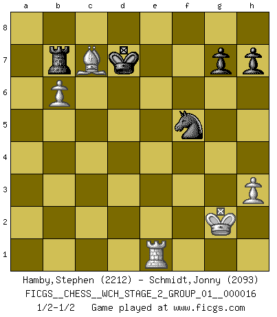 Last move : 1/2-1/2 2017 June 23 23:33:3 [Event "FICGS__CHESS__WCH_STAGE_2_GROUP_01__000016"] [Site "FICGS"] [Date "2017.02.28"] [Round "1"] [White "Hamby,Stephen"] [Black "Schmidt,Jonny"] [Result "1/2-1/2"] [WhiteElo "2212"] [BlackElo "2093"] 1.d4 Nf6 2.c4 e6 3.Nc3 Bb4 4.f3 O-O 5.e4 d5 6.e5 Nfd7 7.cxd5 exd5 8.f4 c5 9.a3 Ba5 10.Be3 Nc6 11.Nf3 cxd4 12.Nxd4 Re8 13.Be2 f6 14.Ndb5 d4 15.Nd6 Re7 16.Bxd4 fxe5 17.Bf2 Nf6 18.fxe5 Nxe5 19.Nxc8 Rxc8 20.O-O a6 21.Qxd8+ Rxd8 22.Rae1 b5 23.h3 Rd2 24.b4 Bc7 25.a4 Bd6 26.Rb1 Rc7 27.Be1 Rc2 28.axb5 axb5 29.Nxb5 Rxe2 30.Nxd6 Nd3 31.Kh1 R7c2 32.Rg1 Nf4 33.Bg3 Nxg2 34.Rgc1 Nh5 35.Bh2 Nh4 36.Rxc2 Rxc2 37.Ne4 Re2 38.Ng3 Nxg3+ 39.Bxg3 Nf5 40.Bh2 Kf7 41.b5 Re7 42.b6 Rb7 43.Kg2 Ke6 44.Re1+ Kd7 45.Bc7 1/2-1/2 Nimzo-Indian : Kmoch variation Kingside Castling by player Black (move 4) Kingside Castling by player White (move 20) 10 pieces endgame at move 39 : White KRBPP , Black KRNPP WHITE : King + 1 Rook 1 Bishop 2 Pawns BLACK : King + 1 Rook 1 Knight 2 Pawns This chess game ended in a draw. Follow this game move after move (download)Nowadays, when you're not a grandmaster at 14, you can forget about it. (Anand Viswanathan) Ich verlor meine Bürgerrechte, mein Gehalt wurde mir nicht mehr bezahlt und ich wurde zensiert und durfte nicht mehr ins Ausland reisen. [nach dem Match Fischer-Taimanov 6:0] (Mark Taimanov) Cualquier cambio de material en una posición debe venir por medio de un mate, una captura o promoción de Peón. (Purdy) Lorsque vous vous retrouvez devant une position atroce, ne tendez pas un ultime piège dérisoire avec l'intention d'abandonner si l'adversaire le déjoue ! Faites-vous plutôt un devoir de résister comme si votre vie en dépendait. Jouez le coup qui vous déplairait au centuple si vous étiez dans la peau de votre tortionnaire ! There are two kinds of people in the world, my friend. Those who have a loaded gun and those who dig. You dig ! (Blondie in The Good, The Bad and The Ugly)
