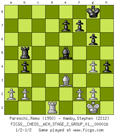 Last move : 1/2-1/2 2017 May 11 12:44:49 [Event "FICGS__CHESS__WCH_STAGE_2_GROUP_01__000016"] [Site "FICGS"] [Date "2017.02.28"] [Round "1"] [White "Pareschi,Remo"] [Black "Hamby,Stephen"] [Result "1/2-1/2"] [WhiteElo "1950"] [BlackElo "2212"] 1.d4 Nf6 2.c4 g6 3.Nc3 Bg7 4.e4 d6 5.Nge2 a6 6.Ng3 h5 7.h3 h4 8.Nge2 b5 9.cxb5 axb5 10.Nxb5 Nxe4 11.Qc2 c6 12.Qxe4 d5 13.Qf3 cxb5 14.Nc3 b4 15.Nxd5 Ra5 16.Bc4 O-O 17.O-O Be6 18.Ne3 Bxc4 19.Nxc4 Rf5 20.Qg4 Qxd4 21.Be3 Qxg4 22.hxg4 Rb5 23.Rfd1 Nc6 24.Rac1 Ne5 25.Nxe5 Bxe5 26.Rc5 Rfb8 27.Rxb5 Rxb5 1/2-1/2 King's Indian : Kramer system Kingside Castling by player Black (move 16) Kingside Castling by player White (move 17) This chess game ended in a draw. Follow this game move after move (download)A bad plan is better than none at all. (Frank Marshall) Wenn sie aufgeben, dann danke ich Ihnen für das Spiel (Eventualzug beim Fernschach). (Anonymous) La pasion por jugar al Ajedrez es una de las mas inexplicables en el mundo. (H.G. Wells) Je fais ceci parce que dans cinquante coups j'obtiendrai cela; je m'appelle Mikhail Moisevitch Botvinnik. (Botvinnik) Who needs drugs and alcohol if he can play Big Chess at FICGS ? (Heinz-Georg Lehnhoff)