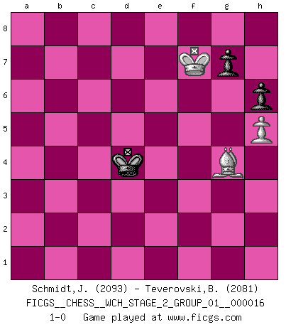 Last move : 1-0 2017 July 5 10:4:47 [Event "FICGS__CHESS__WCH_STAGE_2_GROUP_01__000016"] [Site "FICGS"] [Date "2017.02.28"] [Round "1"] [White "Schmidt,Jonny"] [Black "Teverovski,Bogoljub"] [Result "1-0"] [WhiteElo "2093"] [BlackElo "2081"] 1.e4 e5 2.Nf3 Nc6 3.Bb5 a6 4.Ba4 Nf6 5.O-O Nxe4 6.d4 b5 7.Bb3 d5 8.dxe5 Be6 9.c3 Be7 10.Nbd2 Nc5 11.Bc2 d4 12.cxd4 Nxd4 13.Nxd4 Qxd4 14.Nf3 Qxd1 15.Rxd1 O-O 16.Bg5 Bxg5 17.Nxg5 h6 18.Bh7+ Kh8 19.Nxe6 Nxe6 20.Be4 Rad8 21.g3 Nd4 22.h4 Rfe8 23.f4 c5 24.h5 f6 25.Bg6 Re6 26.Rac1 c4 27.Kg2 fxe5 28.b3 exf4 29.bxc4 f3+ 30.Kf1 bxc4 31.Rxc4 Red6 32.Kf2 Kg8 33.Rc3 Rd5 34.Rcd3 R5d6 35.g4 Kf8 36.Re1 Kg8 37.Re7 Rb8 38.Re4 Rbd8 39.a4 Nf5 40.Rxd6 Nxd6 41.Rf4 Rb8 42.Kxf3 Rb3+ 43.Ke2 Rb6 44.Kd2 a5 45.Kc3 Rc6+ 46.Kd4 Rc4+ 47.Ke5 Rxf4 48.Kxf4 Kf8 49.Ke5 Nc4+ 50.Kd4 Nb6 51.Bc2 Ke7 52.Kc5 Nd7+ 53.Kb5 Kd6 54.Kxa5 Ne5 55.Bf5 Kc5 56.Ka6 Kc6 57.Ka7 Kc7 58.a5 Kc6 59.Kb8 Kb5 60.a6 Kxa6 61.Kc7 Kb5 62.Kd6 Nxg4 63.Bxg4 Kc4 64.Ke6 Kd4 65.Kf7 1-0 Ruy Lopez : Open, 7.Bb3 Kingside Castling by player White (move 5) Kingside Castling by player Black (move 15) 10 pieces endgame at move 48 : White KBPPP , Black KNPPP WHITE : King + 1 Bishop 3 Pawns BLACK : King + 1 Knight 3 Pawns 9 pieces endgame at move 54 : White KBPPP , Black KNPP WHITE : King + 1 Bishop 3 Pawns BLACK : King + 1 Knight 2 Pawns 8 pieces endgame at move 60 : White KBPP , Black KNPP WHITE : King + 1 Bishop 2 Pawns BLACK : King + 1 Knight 2 Pawns 7 pieces endgame at move 62 : White KBP , Black KNPP WHITE : King + 1 Bishop 1 Pawn BLACK : King + 1 Knight 2 Pawns 6 pieces endgame at move 63 : White KBP , Black KPP WHITE : King + 1 Bishop 1 Pawn BLACK : King + 2 Pawns Player White won this chess game. Follow this game move after move (download)Place the contents of the Chess box in a hat, shake them up vigorously, pour them on the board from a height of two feet, and you get the style of Steinitz. (H. E. Bird) Spiel ein langweiliges Spiel zu Ende und lustige Dinge können passieren. (Hans Ree) ¿Que sería del Ajedrez sin errores graciosos?. (Kurt Richter) On entre au jeu d'Echecs comme on entre en Religion. Pour le joueur d'Echecs, la partie d'Echecs c'est l'office, la messe, le défilé du 1er Mai, le dépôt de gerbe au Monument aux Morts. C'est un drame sacré. (Michel Roos) The problem with troubleshooting is that trouble shoots back. (Anonymous)