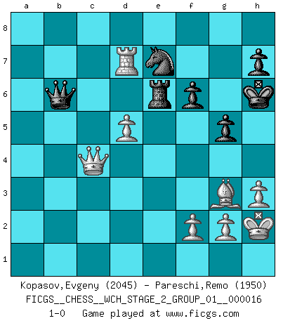 Last move : 1-0 2017 August 6 10:29:10 [Event "FICGS__CHESS__WCH_STAGE_2_GROUP_01__000016"] [Site "FICGS"] [Date "2017.02.28"] [Round "1"] [White "Kopasov,Evgeny"] [Black "Pareschi,Remo"] [Result "1-0"] [WhiteElo "2045"] [BlackElo "1950"] 1.d4 Nf6 2.c4 c5 3.d5 b5 4.cxb5 a6 5.bxa6 e6 6.Nc3 exd5 7.Nxd5 Be7 8.Nxe7 Qxe7 9.Bf4 d5 10.e3 O-O 11.Nf3 Rd8 12.Be2 Bxa6 13.O-O Ne4 14.Bxa6 Nxa6 15.a3 f6 16.b3 Nb8 17.b4 Nc6 18.Qc2 Rdc8 19.b5 Na5 20.h3 g5 21.Bh2 Nc4 22.Rfd1 Qe6 23.a4 Ra5 24.Ne1 Nb6 25.Nd3 d4 26.Re1 c4 27.exd4 cxd3 28.Qxd3 Nxa4 29.b6 Qd5 30.Rab1 Nxb6 31.Rxe4 Qb5 32.Qd1 Qc6 33.Qe1 Rb5 34.Ra1 Nd5 35.Re6 Qd7 36.Bg3 Rf8 37.Kh2 Rb6 38.Rxb6 Nxb6 39.Ra6 Nc8 40.Qe4 Re8 41.Qf3 Re6 42.Qb3 Kf7 43.Ra5 Kg7 44.Rc5 Rc6 45.Qa4 Ne7 46.Ra5 Qd8 47.Ra7 Re6 48.Qc4 Qb6 49.Rd7 Kh6 50.d5 1-0 Benko gambit accepted Kingside Castling by player Black (move 10) Kingside Castling by player White (move 13) Player White won this chess game. Follow this game move after move (download)I am still a victim of Chess. It has all the beauty of art and much more. It cannot be commercialized. Chess is much purer than art in its social position. (Marcel Duchamp) Wenn ich mich einlogge, glauben die Leute gewöhnlich nicht, dass ich es selbst bin und sie fangen an, mir dumme Fragen zu stellen. Und wenn sie es glauben, stellen sie wieder andere dumme Fragen. (Judith Polgar) En el tablero, la mentira e hipocresía no sobreviven mucho. (Emanuel Lasker) Fischer est le meilleur joueur du monde et Karpov n'est qu'un joueur de bistrot. (Garry Kasparov, agé de 16 ans) There is a great deal of difference between an eager man who wants to read a book and a tired man who wants a book to read. (G.K. Chesterton)