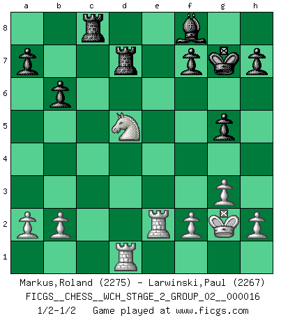 Last move : 1/2-1/2 2017 May 2 17:23:42 [Event "FICGS__CHESS__WCH_STAGE_2_GROUP_02__000016"] [Site "FICGS"] [Date "2017.02.28"] [Round "1"] [White "Markus,Roland"] [Black "Larwinski,Paul"] [Result "1/2-1/2"] [WhiteElo "2275"] [BlackElo "2267"] 1.d4 Nf6 2.c4 e6 3.Nf3 b6 4.g3 Bb7 5.Bg2 Be7 6.O-O O-O 7.Re1 Re8 8.Nc3 d5 9.cxd5 exd5 10.Ne5 c5 11.dxc5 Bxc5 12.Nd3 Bc6 13.Bg5 d4 14.Bxf6 Qxf6 15.Nd5 Qd6 16.Qb3 Nd7 17.N5f4 g5 18.Bxc6 Qxc6 19.Qd5 Qxd5 20.Nxd5 Rac8 21.Rad1 Bf8 22.e4 dxe3 23.Rxe3 Re6 24.Kg2 Rd6 25.Ne5 Kg7 26.Nxd7 Rxd7 27.Re2 1/2-1/2 Queen's Indian : Old Main line, 6.O-O Kingside Castling by player White (move 6) Kingside Castling by player Black (move 6) This chess game ended in a draw. Follow this game move after move (download)My opponents make good moves too. Sometimes I don't take these things into consideration. (Bobby Fischer) Mit sehr nachdenklichem Gesicht schreitet Bobby durch den Turniersaal. Was ist passiert?, fragt Lombardy. Ich stehe schlecht, antwortet Fischer. Lombardy: Dann biete doch einfach Remis an. Fischer: So schlecht stehe ich nun auch wieder nicht! (Robert James Fischer) Con el tiempo, empecé a progresar en partidas decisivas. Tal vez porque me di cuenta de una simple verdad: no solo estaba yo nervioso sino también mi oponente. (Mikhail Tal) La vie est comme un jeu d'échecs : nous esquissons un plan, mais celui-ci est tributaire de ce que daignent faire l'adversaire aux échecs et le destin dans la vie. (Arthur Schopenhauer) First of all, we have to go back to the classical time control. (Anatoly Karpov)