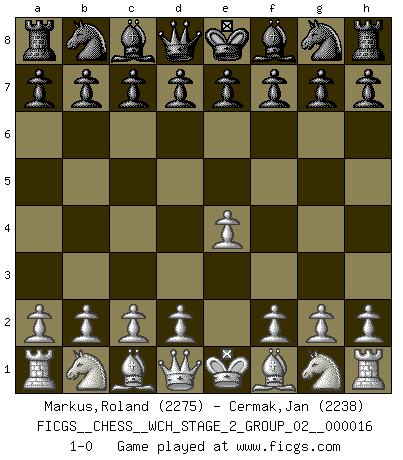 Last move : 1-0 2017 March 30 22:8:18 [Event "FICGS__CHESS__WCH_STAGE_2_GROUP_02__000016"] [Site "FICGS"] [Date "2017.02.28"] [Round "1"] [White "Markus,Roland"] [Black "Cermak,Jan"] [Result "1-0"] [WhiteElo "2275"] [BlackElo "2238"] 1.e4 1-0 This chess game has been lost on time (started : 2017.02.28 2:38:43) King's pawn Opening Player White won this chess game. Follow this game move after move (download)The chessboard is the world, the pieces are the phenomena of the Universe, the rules of the game are what we call the laws of Nature and the player on the other side is hidden from us. (Thomas Huxley) Die Arbeit ist etwas Unnatürliches. Die Faulheit allein ist göttlich. (Anatole France) Un Peón pasado aumenta su poder a medida de que el número de piezas en el tablero disminuye. (Capablanca) Vous n'êtes pas toujours obligé de jouer le meilleur coup. Un coup doit être actif, entreprenant, correct et beau ! (David Bronstein) Either move or be moved. (Ezra Pound)