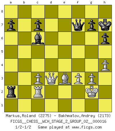 Last move : 1/2-1/2 2017 May 3 3:0:31 [Event "FICGS__CHESS__WCH_STAGE_2_GROUP_02__000016"] [Site "FICGS"] [Date "2017.02.28"] [Round "1"] [White "Markus,Roland"] [Black "Bakhmatov,Andrey"] [Result "1/2-1/2"] [WhiteElo "2275"] [BlackElo "2173"] 1.Nf3 Nf6 2.c4 e6 3.g3 d5 4.Bg2 Be7 5.d4 O-O 6.O-O dxc4 7.Ne5 Nc6 8.Bxc6 bxc6 9.Nxc6 Qe8 10.Nxe7+ Qxe7 11.Qa4 e5 12.dxe5 Qxe5 13.Qxc4 Be6 14.Qd3 Rad8 15.Qe3 Qh5 16.f3 Bc4 17.Nc3 Rfe8 18.Qf2 Nd5 19.Re1 Nxc3 20.bxc3 Qa5 21.e4 Rd3 22.Bf4 Red8 23.Rac1 h6 24.Kg2 f5 25.exf5 Qxf5 26.Re5 Qg6 27.h4 Bd5 28.Re3 Rxe3 29.Qxe3 Bc6 30.Qe2 Rd3 31.Be3 Qf7 32.Rc2 Rd5 33.Qf1 Ra5 34.Qd1 Rxa2 35.Qd8+ Kh7 36.Qd3+ 1/2-1/2 Reti Opening Kingside Castling by player Black (move 5) Kingside Castling by player White (move 6) This chess game ended in a draw. Follow this game move after move (download)You know, comrade Pachman, I don't enjoy being a Minister, I would rather play Chess like you. (Che Guevara) Das Zentrum ist der Balkan des Schachbretts - Kriegshandlungen können in jedem Moment ausbrechen. (Aaron Nimzowitsch) La vida es como el Ajedrez, con lucha, competición y eventos buenos y malos. (Benjamin Franklin) Le moment que je préfère le plus dans une rencontre, c'est celui où je sens que la personnalité de l'adversaire se brise. (Robert Fischer) I would love to change the world, but they won't give me the source code. (Unknown)