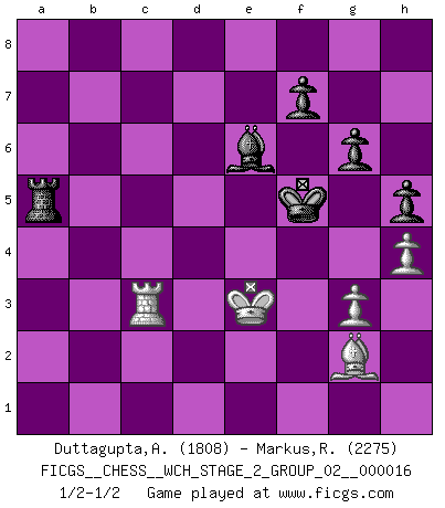 Last move : 1/2-1/2 2017 September 18 20:15:16 [Event "FICGS__CHESS__WCH_STAGE_2_GROUP_02__000016"] [Site "FICGS"] [Date "2017.02.28"] [Round "1"] [White "Duttagupta,Aniruddha"] [Black "Markus,Roland"] [Result "1/2-1/2"] [WhiteElo "1808"] [BlackElo "2275"] 1.c4 e5 2.g3 Nf6 3.Bg2 Nc6 4.Nc3 Bc5 5.Nf3 d6 6.O-O O-O 7.d3 h6 8.a3 a6 9.b4 Ba7 10.Bb2 Be6 11.Rc1 Qd7 12.e3 Ne7 13.Re1 Rad8 14.Qc2 Rfe8 15.a4 c6 16.Ne4 Nxe4 17.dxe4 Qc7 18.c5 Ng6 19.Ba3 dxc5 20.bxc5 Qa5 21.Rb1 Rd7 22.Bf1 Bg4 23.Be2 Qd8 24.Bb4 Qf6 25.Kg2 Qe6 26.Red1 Rxd1 27.Bxd1 Rd8 28.Nd2 Bh3+ 29.Kg1 Qe7 30.Be2 Nf8 31.Nc4 Ne6 32.Ba5 Ra8 33.Nxe5 Ng5 34.f4 Bxc5 35.Bb6 Bd6 36.Bd4 Bxe5 37.Bxe5 Re8 38.Qd3 b5 39.Qc3 Nxe4 40.Qxc6 Nd2 41.Rc1 Nc4 42.axb5 Nxe5 43.fxe5 Qxe5 44.Rc3 axb5 45.Qxb5 Qe4 46.Qc6 Qxc6 47.Rxc6 Rxe3 48.Kf2 Re4 49.Bf3 Ra4 50.Bd5 Ra5 51.Bb3 Ra7 52.Rb6 Kf8 53.Rb4 h5 54.Bd5 Rd7 55.Bf3 g6 56.Ke3 Ra7 57.Bd5 Ra3+ 58.Kf2 Ra5 59.Bc4 Ra7 60.Kf3 Kg7 61.Rb6 Rc7 62.Bb3 Bg4+ 63.Kf2 Rd7 64.Kf1 Kh6 65.Ke1 Re7+ 66.Kf1 Kg7 67.h4 Rd7 68.Bc2 Rd2 69.Be4 Be6 70.Rb4 Kf6 71.Bf3 Rc2 72.Ke1 Ke5 73.Re4+ Kd6 74.Re2 Rc3 75.Rd2+ Ke5 76.Kf2 Bc4 77.Bg2 Rb3 78.Bc6 Rb6 79.Bf3 Rb4 80.Rc2 Be6 81.Re2+ Kf5 82.Rd2 Ra4 83.Rd3 Ra2+ 84.Ke3 Ke5 85.Rc3 Ra5 86.Bg2 Kf5 1/2-1/2 English Opening Kingside Castling by player White (move 6) Kingside Castling by player Black (move 6) This chess game ended in a draw. Follow this game move after move (download)Fischer Chess play was always razor-sharp, rational and brilliant. One of the best ever. (Dave Regis) Ich verachte die Medien. (Robert James Fischer) Aún deseo matar a Fischer. (Boris Spassky) Karpov est une pièce de musée. (Garry Kasparov) When the going gets tactical, the computers get going. (Hyatt)