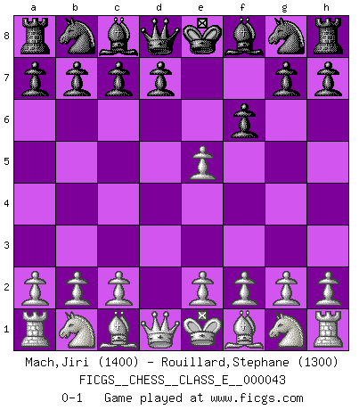 Last move : 0-1 2007 May 28 11:24:15 [Event "FICGS__CHESS__CLASS_E__000043"] [Site "FICGS"] [Date "2007.04.04"] [Round "1"] [White "Mach,Jiri"] [Black "Rouillard,Stephane"] [Result "0-1"] [WhiteElo "1400"] [BlackElo "1300"] 1.d4 e5 2.dxe5 f6 0-1 This chess game has been lost on time (started : 2007.04.04 9:31:25) Queen's pawn : Charlick (Englund) gambit Player Black won this chess game. Follow this game move after move (download)Adequate compensation for a sacrifice is having a sound combination leading to a winning position; adequate compensation for a blunder is having your opponent snatch defeat from the jaws of victory. (Bruce A. Moon) Irgendwie scheint mir sonntags früh um 9 Uhr der Killerinstinkt verloren gegangen zu sein. (Alexej Shirov) Un Peón pasado aumenta su poder a medida de que el número de piezas en el tablero disminuye. (Capablanca) Le jeu d'échecs est comme rejeté hors du temps. (Antoine de Saint-Exupéry) Opportunities multiply as they are seized. (Sun Tzu)
