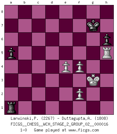Last move : 1-0 2017 June 10 20:33:26 [Event "FICGS__CHESS__WCH_STAGE_2_GROUP_02__000016"] [Site "FICGS"] [Date "2017.02.28"] [Round "1"] [White "Larwinski,Paul"] [Black "Duttagupta,Aniruddha"] [Result "1-0"] [WhiteElo "2267"] [BlackElo "1808"] 1.d4 d5 2.c4 c6 3.Nf3 Nf6 4.Nc3 e6 5.e3 Nbd7 6.Bd3 dxc4 7.Bxc4 b5 8.Bd3 Bb7 9.a3 Bd6 10.O-O O-O 11.Qc2 Rc8 12.Rd1 c5 13.Bxb5 Bxf3 14.gxf3 cxd4 15.Rxd4 Be5 16.Rd1 Rc5 17.Bf1 Nd5 18.f4 Bxc3 19.bxc3 Nxc3 20.Rd4 Qc7 21.Qd3 Nb6 22.a4 Rc6 23.a5 Nbd5 24.Bd2 f5 25.Bg2 Rc5 26.h3 Rc8 27.Kh2 Qe7 28.Rc1 R8c7 29.Rc2 h6 30.Bxc3 Rxc3 31.Rxc3 Nxc3 32.a6 Kh7 33.Bb7 Na2 34.Bf3 Nb4 35.Qb5 Qh4 36.Rd2 Nd5 37.Qb8 Rc1 38.Bxd5 exd5 39.Qf8 Qh5 40.Rxd5 Rf1 41.Kg2 Ra1 42.Qxf5+ Qxf5 43.Rxf5 Rxa6 44.Rc5 g6 45.h4 Kg7 46.h5 gxh5 47.Rxh5 Ra1 48.e4 a5 49.Kg3 1-0 This chess game has been lost on time (started : 2017.02.28 2:38:43) QGD Slav : 4.Nc3 Kingside Castling by player White (move 10) Kingside Castling by player Black (move 10) 10 pieces endgame at move 46 : White KRPPP , Black KRPPP WHITE : King + 1 Rook 3 Pawns BLACK : King + 1 Rook 3 Pawns 9 pieces endgame at move 47 : White KRPPP , Black KRPP WHITE : King + 1 Rook 3 Pawns BLACK : King + 1 Rook 2 Pawns Player White won this chess game. Follow this game move after move (download)All my games are real. (Bobby Fischer) Ich war schon mal beim Dopingtest. Da musste ich Urin abgeben, während Dritte zusahen. (Elisabeth Pähtz) El Ajedrez es una guerra en un tablero. El objetivo es aplastar la mente del oponente. (Bobby Fischer) On entre au jeu d'Echecs comme on entre en Religion. Pour le joueur d'Echecs, la partie d'Echecs c'est l'office, la messe, le défilé du 1er Mai, le dépôt de gerbe au Monument aux Morts. C'est un drame sacré. (Michel Roos) Political correctness is subjecting us to gross incompetence. (Johann Piek)