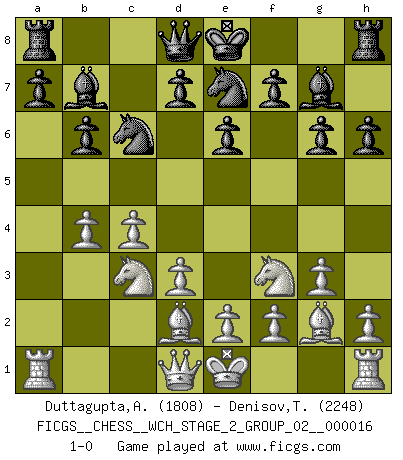 Last move : 1-0 2017 May 16 4:11:7 [Event "FICGS__CHESS__WCH_STAGE_2_GROUP_02__000016"] [Site "FICGS"] [Date "2017.02.28"] [Round "1"] [White "Duttagupta,Aniruddha"] [Black "Denisov,Timofey"] [Result "1-0"] [WhiteElo "1808"] [BlackElo "2248"] 1.c4 c5 2.g3 Nc6 3.Bg2 g6 4.Nc3 Bg7 5.Nf3 e6 6.d3 Nge7 7.Bg5 h6 8.Bd2 b6 9.a3 Bb7 10.b4 cxb4 11.axb4 1-0 This chess game has been lost on time (started : 2017.02.28 2:38:43) English : Symmetrical variation Player White won this chess game. Follow this game move after move (download)The game of chess is the touchstone of the intellect. (Goethe) Wenn Spassky eine Figur opfert kannst du genauso gut aufgeben. Aber wenn Tal eine Figur opfert, spiel weiter. Er könnte noch eine weitere opfern, und dann ... wer weiß? (Miguel Najdorf) Todavía soy una víctima del Ajedrez. Tiene toda la belleza del arte y mucho mas. No puede ser comercializado. El Ajedrez es mas puro que el arte en su posición social. (Marcel Duchamp) J'apprécie les joueurs d'est-indienne, c'est grâce à eux que je nourris ma famille depuis tant d'années. (Petrosian) Being number two sucks. (Andre Agassi)