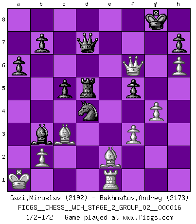 Last move : 1/2-1/2 2017 May 23 18:12:2 [Event "FICGS__CHESS__WCH_STAGE_2_GROUP_02__000016"] [Site "FICGS"] [Date "2017.02.28"] [Round "1"] [White "Gazi,Miroslav"] [Black "Bakhmatov,Andrey"] [Result "1/2-1/2"] [WhiteElo "2192"] [BlackElo "2173"] 1.d4 Nf6 2.c4 g6 3.f3 d5 4.cxd5 Nxd5 5.e4 Nb6 6.Nc3 Bg7 7.Be3 O-O 8.Qd2 Nc6 9.O-O-O Qd6 10.Nb5 Qd7 11.Kb1 Rd8 12.d5 a6 13.Nc3 Qe8 14.Qc1 Na5 15.Nge2 e6 16.Bg5 f6 17.Bf4 Qf7 18.h4 exd5 19.h5 g5 20.h6 Bf8 21.Bxg5 c5 22.Ka1 Be6 23.Bd2 dxe4 24.Nxe4 Nc6 25.Rh4 Nc4 26.Bc3 Rxd1 27.Qxd1 Be7 28.Nf4 Ne3 29.Qc1 f5 30.Nd6 Bxd6 31.Qxe3 Bxa2 32.Rh3 Bxf4 33.Qxf4 Rd8 34.Be2 Kf8 35.Rh1 Bb3 36.Re1 Rd5 37.g4 Qe6 38.Qc7 Qd7 39.Qb6 Nd4 40.Qf6+ Kg8 1/2-1/2 King's Indian defense Kingside Castling by player Black (move 7) Queenside Castling by player White (move 9) This chess game ended in a draw. Follow this game move after move (download)I prefer to lose a really good game than to win a bad one. (David Levy) Schach ist Krieg, im Schach geht es um testosterongesteuerte Urschreie. (Garry Kasparov) Hay dos clases de hombres: aquellos que se conforman en dejarse llevar por las circunstancias y que juegan barajas y aquellos decididos a controlar las circunstancias y que juegan al Ajedrez. (Mortimer Collins) Un journaliste : 'Vous préférez avoir une dame de plus sur l'échiquier ou au lit ?' Boris Spassky : 'Ca dépend de la position.' In theory there is no difference between theory and practice. In practice there is. (Yogi Berra)