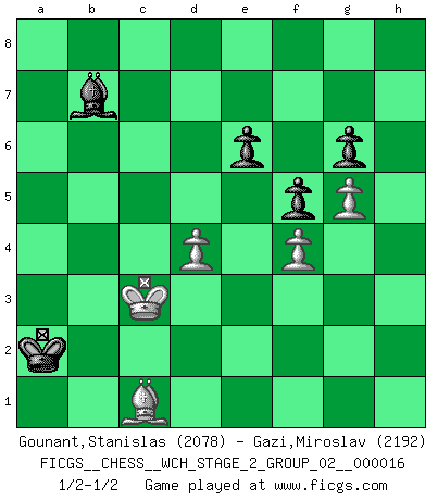 Last move : 1/2-1/2 2017 July 7 19:37:39 [Event "FICGS__CHESS__WCH_STAGE_2_GROUP_02__000016"] [Site "FICGS"] [Date "2017.02.28"] [Round "1"] [White "Gounant,Stanislas"] [Black "Gazi,Miroslav"] [Result "1/2-1/2"] [WhiteElo "2078"] [BlackElo "2192"] 1.d4 Nf6 2.Nf3 e6 3.e3 c5 4.Bd3 d5 5.b3 Nc6 6.O-O Be7 7.Bb2 O-O 8.Nbd2 cxd4 9.exd4 Nb4 10.Be2 b6 11.c3 Nc6 12.Rc1 Re8 13.Ne5 Bb7 14.f4 Ne4 15.Bb5 Rc8 16.Nxe4 dxe4 17.Qe2 f5 18.Rcd1 Rf8 19.Bxc6 Bxc6 20.c4 Bb7 21.h3 Qc7 22.Bc1 b5 23.cxb5 Bd5 24.Be3 Ba3 25.Nc4 Be7 26.Rc1 Qb7 27.Ne5 Rfe8 28.Rxc8 Rxc8 29.Rc1 Rxc1+ 30.Bxc1 Qb6 31.Be3 Qa5 32.Kh2 h6 33.Nc6 Qc7 34.Nxe7+ Qxe7 35.Qc2 Qb4 36.Qe2 Kf7 37.h4 Kg8 38.Kh3 Qc3 39.g4 Kf7 40.g5 Qa1 41.Kg2 Qb1 42.Kh2 Ke7 43.Kg2 hxg5 44.hxg5 g6 45.Kh2 Kd7 46.Kg2 Kc7 47.Kh2 Kb6 48.Kg2 Qd3 49.Qxd3 exd3 50.Kf2 Kxb5 51.Bd2 Be4 52.Ke3 Kc6 53.Bc3 a6 54.Ba5 Kb5 55.Bd2 a5 56.Bc3 a4 57.Bd2 Bd5 58.bxa4+ Kxa4 59.Kxd3 Ka3 60.Bc1+ Kxa2 61.Kc3 Be4 62.Bb2 Bb7 63.Bc1 1/2-1/2 Queen's pawn : Yusupov-Rubinstein system Kingside Castling by player White (move 6) Kingside Castling by player Black (move 7) 10 pieces endgame at move 60 : White KBPPP , Black KBPPP WHITE : King + 1 Bishop 3 Pawns BLACK : King + 1 Bishop 3 Pawns This chess game ended in a draw. Follow this game move after move (download)If your opponent cannot do anything active, then don't rush the position; instead you should let him sit there, suffer, and beg you for a draw. (Jeremy Silman) In Buenos Aires ist es nicht mein vorrangiges Ziel ein starkes Turnier zu organisieren, sondern ein Turnier für Gentlemen. Ich würde nie Kamsky einladen. Ich mag keine Probleme. (Miguel Najdorf) Una clavada es mas poderosa que una espada. (Fred Reinfeld) Toutes les manuvres exécutées sur une colonne ouverte ont pour but ultime l'intrusion définitive sur la septième ou la huitième rangée, en plein cur de la position ennemie. (Aaron Nimzovitch) You can only get smarter by playing a smarter opponent. (Revolver, movie)