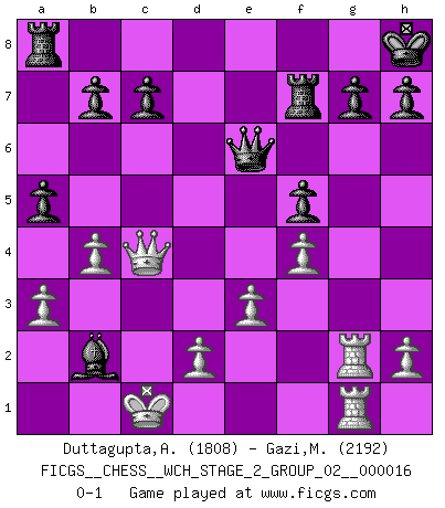 Last move : 0-1 2017 May 5 6:13:58 [Event "FICGS__CHESS__WCH_STAGE_2_GROUP_02__000016"] [Site "FICGS"] [Date "2017.02.28"] [Round "1"] [White "Duttagupta,Aniruddha"] [Black "Gazi,Miroslav"] [Result "0-1"] [WhiteElo "1808"] [BlackElo "2192"] 1.c4 e5 2.Nc3 Nf6 3.Nf3 Nc6 4.a3 d5 5.cxd5 Nxd5 6.Qc2 Be7 7.e3 O-O 8.Nxd5 Qxd5 9.Bd3 Kh8 10.Be4 Qe6 11.b4 Bd7 12.Bb2 f5 13.Bxc6 Bxc6 14.Nxe5 Bxg2 15.Rg1 Bf6 16.Rxg2 Bxe5 17.O-O-O a5 18.Rdg1 Rf7 19.f4 Bf6 20.Qc4 Bxb2+ 0-1 English Opening Kingside Castling by player Black (move 7) Queenside Castling by player White (move 17) Player Black won this chess game. Follow this game move after move (download)My God, Bobby Fischer plays so simply. (Alexei Suetin) Ich verstehe den Grund nicht, warum die Aufteilung in Frauen und Männer überhaupt im Schach besteht. (Judith Polgar) Fischer deseaba darle a los Rusos una sopa de su propia medicina. (Larry Evans) Les Echecs représentent une sphère d'idées créatrices basée sur la volonté des deux protagonistes. (Smyslov) Luck never gives; it only lends. (Swedish proverb)