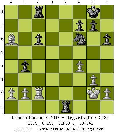 Last move : 1/2-1/2 2007 August 19 23:28:41 [Event "FICGS__CHESS__CLASS_E__000043"] [Site "FICGS"] [Date "2007.04.04"] [Round "1"] [White "Miranda,Marcus"] [Black "Nagy,Attila"] [Result "1/2-1/2"] [WhiteElo "1434"] [BlackElo "1300"] 1.d4 d5 2.c4 c6 3.Nf3 Nf6 4.Nc3 e6 5.e3 Nbd7 6.Qc2 Bd6 7.Bd3 O-O 8.O-O dxc4 9.Bxc4 b5 10.Be2 a6 11.e4 e5 12.Rd1 Qc7 13.g3 h6 14.Kg2 Re8 15.dxe5 Nxe5 16.Bf4 Nxf3 17.Bxd6 Ne1+ 18.Rxe1 Qxd6 19.f4 Qc5 20.Rac1 b4 21.Na4 Qxc2 22.Rxc2 Rxe4 23.Nb6 Rb8 24.Nxc8 Rxc8 25.Bxa6 Rxe1 1/2-1/2 QGD Slav : 4.Nc3 Kingside Castling by player Black (move 7) Kingside Castling by player White (move 8) This chess game ended in a draw. Follow this game move after move (download)The most powerful weapon in Chess is to have the next move. (David Bronstein) Es tut gut, die Entwicklungsperiode von, [...] demokratischem Geist durchdringen zu lassen. Wie undemokratisch wäre es doch beispielsweise, den einen Offizier große Spaziertouren vornehmen zu lassen, während die anderen zu Hause säßen und sich entsetzlich langweilten. (Aaron Nimzowitsch) Si el Ajedrez es una ciencia, es la mas inexacta. Si el Ajedrez es un arte, es demasiado inexacto para ser visto como tal. Si el Ajedrez es un deporte, es demasiado esotérico. Si el Ajedrez es un juego, es demasiado exigente para ser solo un juego. Si el Ajedrez es una aventura, es una muy demandante. Si el Ajedrez es una pasión, es una muy gratificante. Si el Ajedrez es la vida, es una muy triste. (Anónimo) Le moment que je préfère le plus dans une rencontre, c'est celui où je sens que la personnalité de l'adversaire se brise. (Robert Fischer) I would love to change the world, but they won't give me the source code. (Unknown)