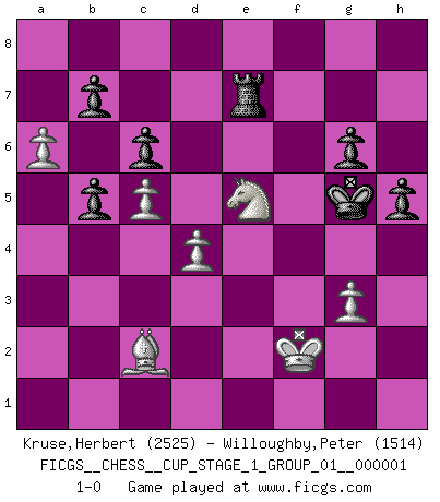 Last move : 1-0 2017 May 29 14:47:54 [Event "FICGS__CHESS__CUP_STAGE_1_GROUP_01__000001"] [Site "FICGS"] [Date "2017.03.01"] [Round "1"] [White "Kruse,Herbert"] [Black "Willoughby,Peter"] [Result "1-0"] [WhiteElo "2525"] [BlackElo "1514"] 1.Nf3 d5 2.g3 Nf6 3.Bg2 g6 4.c4 c6 5.b3 Bg7 6.Bb2 O-O 7.O-O Nbd7 8.a4 dxc4 9.bxc4 Qc7 10.d3 Re8 11.Nbd2 e5 12.e3 e4 13.Nxe4 Nxe4 14.Bxg7 Nxf2 15.Rxf2 Kxg7 16.d4 Nf6 17.Ne5 Bf5 18.a5 a6 19.e4 Bxe4 20.Rxf6 Kxf6 21.Bxe4 Rad8 22.Bb1 Kg7 23.Nf3 Qe7 24.Bd3 Qf6 25.Rb1 Rd7 26.Kg2 Re3 27.Rb2 Rde7 28.Rf2 Qd6 29.Qb3 f5 30.c5 Qd7 31.Qc4 f4 32.Re2 Rxe2+ 33.Bxe2 fxg3 34.hxg3 Qf5 35.Bd1 Qb1 36.Bb3 Kh6 37.Bc2 Qb5 38.Qxb5 axb5 39.Ne5 Kg5 40.Kf2 h5 41.a6 1-0 Reti : King's Indian attack (Barcza system) Kingside Castling by player Black (move 6) Kingside Castling by player White (move 7) Player White won this chess game. Follow this game move after move (download)Excellence at Chess is one mark of a scheming mind. (Sir Arthur Conan Doyle) Es gibt Leute, die glauben, alles wäre vernünftig, was man mit einem ernsthaften Gesicht tut. (Georg Christoph Lichtenberg) ¿Quién es tu oponente esta tarde? Esta tarde mi oponente son las piezas negras. (Akiba Rubinstein) Tous ces prétendus hommes politiques sont les pions, les Cavaliers, les Tours ou les Fous d'une partie d'échecs qui se jouera tant qu'un hasard ne renversera pas l'échiquier. (Honoré de Balzac) Never was anything great achieved without danger. (Niccolo Machiavelli)