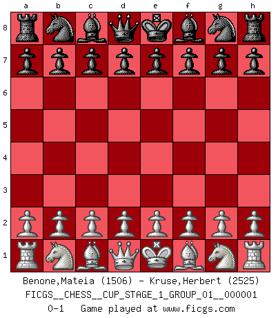 Last move : 0-1 2017 March 31 10:9:14 [Event "FICGS__CHESS__CUP_STAGE_1_GROUP_01__000001"] [Site "FICGS"] [Date "2017.03.01"] [Round "1"] [White "Benone,Mateia"] [Black "Kruse,Herbert"] [Result "0-1"] [WhiteElo "1506"] [BlackElo "2525"] 0-1 This chess game has been lost on time (started : 2017.03.01 0:58:24) Player Black won this chess game. Follow this game move after move (download)All I want to do, ever, is just play Chess. (Bobby Fischer) Wenn Capablanka heute auf der Schachbühne erscheinen würde, hätte er ein halbes Jahr gebraucht um sich die Schachtheorie anzueignen. Und dann hätte er alles und jeden besiegt. (Mikhail Moiseyevich Botvinik) No puedes jugar al Ajedrez si eres de corazón noble. (Proverbio Francés) Aidez vos pièces, elles vous aideront. (Paul Morphy) Have no fear of perfection - you'll never reach it. (Salvador Dali)