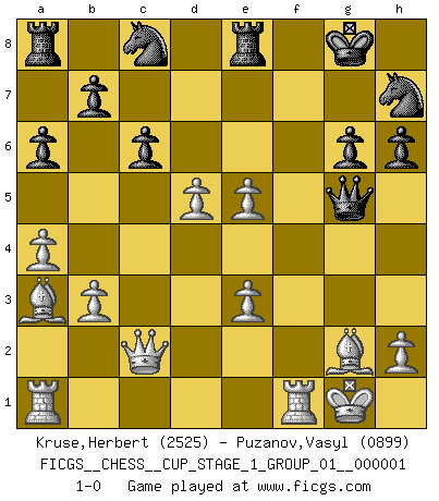 Last move : 1-0 2017 April 29 22:53:18 [Event "FICGS__CHESS__CUP_STAGE_1_GROUP_01__000001"] [Site "FICGS"] [Date "2017.03.01"] [Round "1"] [White "Kruse,Herbert"] [Black "Puzanov,Vasyl"] [Result "1-0"] [WhiteElo "2525"] [BlackElo "0899"] 1.Nf3 d5 2.g3 g6 3.d4 Bg7 4.Bg2 Nf6 5.c4 c6 6.Nbd2 O-O 7.b3 Bg4 8.O-O Bxf3 9.Nxf3 Nbd7 10.Bb2 e6 11.a4 Ne4 12.Qc2 Ndf6 13.e3 a6 14.Ne5 Nd6 15.Ba3 h6 16.g4 Re8 17.f3 Nc8 18.f4 Nh7 19.f5 exf5 20.gxf5 Qg5 21.fxg6 fxg6 22.cxd5 Bxe5 23.dxe5 1-0 Reti : King's Indian attack Kingside Castling by player Black (move 6) Kingside Castling by player White (move 8) Player White won this chess game. Follow this game move after move (download)The passed Pawn is a criminal, who should be kept under lock and key. Mild measures, such as police surveillance, are not sufficient. (Aaron Nimzovich) Ein Isolani verdüstert die Stimmung auf dem ganzen Schachbrett. (Savielly Grigorievitsch Tartakower) No nos podemos resistir a la fascinación de un sacrificio ya que la pasión por los sacrificios es parte de la naturaleza de un jugador de Ajedrez. (Rudolf Spielman) Tout change constamment, y compris dans le monde des Echecs. (Botvinnik) Life is the sum of all your choices. (Albert Camus)