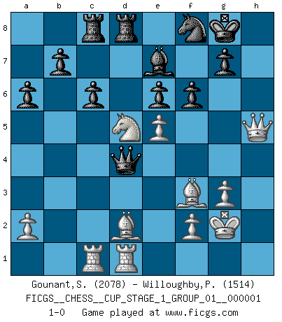 Last move : 1-0 2017 May 7 13:40:1 [Event "FICGS__CHESS__CUP_STAGE_1_GROUP_01__000001"] [Site "FICGS"] [Date "2017.03.01"] [Round "1"] [White "Gounant,Stanislas"] [Black "Willoughby,Peter"] [Result "1-0"] [WhiteElo "2078"] [BlackElo "1514"] 1.d4 d5 2.Nf3 Nf6 3.e3 Bf5 4.c4 e6 5.Nc3 c6 6.Nh4 Bg6 7.Nxg6 hxg6 8.Bd2 Bd6 9.Qb3 Qc7 10.Rc1 dxc4 11.Qxc4 Be7 12.g3 a6 13.Bg2 O-O 14.O-O Nbd7 15.e4 Rac8 16.Qe2 Qb8 17.Rfd1 Rfd8 18.e5 Nd5 19.h4 Nf8 20.h5 gxh5 21.Qxh5 Qa7 22.Ne2 Qb6 23.Bf3 Qxb2 24.Kg2 f6 25.Nf4 Qxd4 26.Nxd5 1-0 Queen's pawn game Kingside Castling by player Black (move 13) Kingside Castling by player White (move 14) Player White won this chess game. Follow this game move after move (download)Pawn endings are to Chess what putting is to golf. (Cecil Purdy) Wenn es im Universum noch irgendwo intelligente Lebewesen gibt, dann kennen sie Go. (Emanuel Lasker) Bobby Fischer es el mas grande genio de Ajedrez de todos los tiempos. (Alexander Kotov) Psychologiquement, tu dois avoir confiance en toi même, mais cette confiance doit être basée sur des faits. (Robert Fischer) I don't know, I don't care, and it doesn't make any difference. (Albert Einstein)