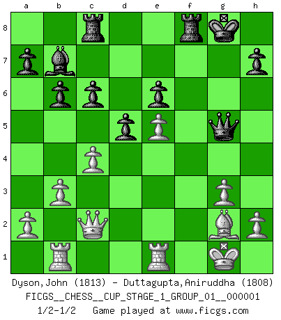 Last move : 1/2-1/2 2017 May 3 20:15:45 [Event "FICGS__CHESS__CUP_STAGE_1_GROUP_01__000001"] [Site "FICGS"] [Date "2017.03.01"] [Round "1"] [White "Dyson,John"] [Black "Duttagupta,Aniruddha"] [Result "1/2-1/2"] [WhiteElo "1813"] [BlackElo "1808"] 1.d4 Nf6 2.c4 e6 3.g3 d5 4.Nf3 Bb4+ 5.Bd2 Be7 6.Bg2 O-O 7.O-O c6 8.Qc2 Nbd7 9.Rd1 b6 10.b3 Ne4 11.Bf4 Bb7 12.Nc3 f5 13.Rab1 Rc8 14.Nxe4 fxe4 15.Ne5 Nxe5 16.Bxe5 Bf6 17.f3 exf3 18.exf3 Bxe5 19.dxe5 Qe7 20.f4 g5 21.fxg5 Qxg5 22.Re1 1/2-1/2 Catalan Opening Kingside Castling by player Black (move 6) Kingside Castling by player White (move 7) This chess game ended in a draw. Follow this game move after move (download)There are tough players and nice guys, and I'm a tough player. (Bobby Fischer) Kann Schach nicht schließlich das Nationalspiel der Deutschen werden? Und welche weiteren Ausblicke bieten sich dann dar! Welche Hebung des allgemeinen Kultur-Niveaus, ja der Moral, wenn das Schachbrett den Kartentisch verdrängen würde! Wahrlich, ein Ziel, des Schweißes der Edlen wert! (Siegbert Tarrasch) No es una movida, aún la mejor movida que tu debas buscar, sino un plan comprensible. (Eugene Znosko-Borovsky) A chaque perte on perd un peu de soi. (Joël Lautier) Computers make it easier to do a lot of things, but most of the things they make it easier to do don't need to be done. (Andy Rooney)