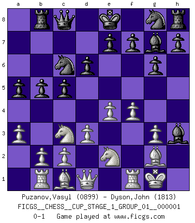 Last move : 0-1 2017 April 27 13:3:24 [Event "FICGS__CHESS__CUP_STAGE_1_GROUP_01__000001"] [Site "FICGS"] [Date "2017.03.01"] [Round "1"] [White "Puzanov,Vasyl"] [Black "Dyson,John"] [Result "0-1"] [WhiteElo "0899"] [BlackElo "1813"] 1.e4 c5 2.Nc3 Nc6 3.g3 g6 4.Bg2 Bg7 5.Nge2 Rb8 6.O-O b5 7.a3 d6 8.d3 Bd7 9.Rb1 a5 10.h3 Qc8 11.f4 Bxh3 0-1 This chess game has been lost on time (started : 2017.03.01 0:58:24) Sicilian : Closed Kingside Castling by player White (move 6) Player Black won this chess game. Follow this game move after move (download)A Chess game is a dialogue, a conversation between a player and his opponent. Each move by the opponent may contain threats or be a blunder, but a player cannot defend against threats or take advantage of blunders if he does not first ask himself: What is my opponent planning after each move ? (Bruce A. Moon) Mein Gehirn das ist mein zweitwichtigstes Organ [Aus dem Film: Der Schläfer]. (Woody Allen) Cada Peón es potencialmente una Reina. (James Mason) Les échecs sont un jeu terrible. Si vous n'avez pas le centre, votre adversaire a une position plus libre. Par contre, si vous avez le centre, alors vous avez vraiment quelque chose pour laquelle vous inquiéter ! (Siegbert Tarrasch) There are two types of people in this world, good and bad. The good sleep better, but the bad seem to enjoy the waking hours much more. (Woody Allen)