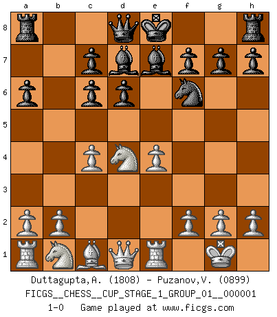 Last move : 1-0 2017 April 27 19:17:34 [Event "FICGS__CHESS__CUP_STAGE_1_GROUP_01__000001"] [Site "FICGS"] [Date "2017.03.01"] [Round "1"] [White "Duttagupta,Aniruddha"] [Black "Puzanov,Vasyl"] [Result "1-0"] [WhiteElo "1808"] [BlackElo "0899"] 1.e4 e5 2.Nf3 Nc6 3.Bb5 a6 4.Ba4 Nf6 5.O-O d6 6.Bxc6+ bxc6 7.d4 exd4 8.Nxd4 Bd7 9.Re1 Be7 10.c4 1-0 Ruy Lopez : Steinitz defense deferred (Russian defense) Kingside Castling by player White (move 5) Player White won this chess game. Follow this game move after move (download)Fischer Chess play was always razor-sharp, rational and brilliant. One of the best ever. (Dave Regis) Ich las kürzlich ein Buch von Nietzsche. Er sagte Religion verdumme nur die Menschen. Ich stimme zu. (Robert James Fischer) Cuando tu no sabes absolutamente que mas hacer, es tiempo de entrar en pánico. (John van der Wiel) J'apprécie les joueurs d'est-indienne, c'est grâce à eux que je nourris ma famille depuis tant d'années. (Petrosian) Fortune favours the audacious. (Desiderius Erasmus)