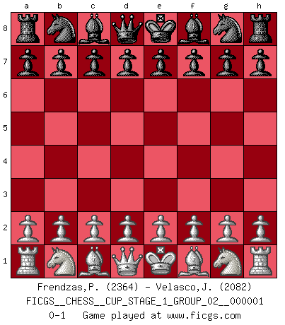 Last move : 0-1 2017 March 31 10:9:14 [Event "FICGS__CHESS__CUP_STAGE_1_GROUP_02__000001"] [Site "FICGS"] [Date "2017.03.01"] [Round "1"] [White "Frendzas,Panayotis"] [Black "Velasco,Jose Maria"] [Result "0-1"] [WhiteElo "2364"] [BlackElo "2082"] 0-1 This chess game has been lost on time (started : 2017.03.01 0:58:30) Player Black won this chess game. Follow this game move after move (download)You know, comrade Pachman, I don't enjoy being a Minister, I would rather play Chess like you. (Che Guevara) Als er Schachweltmeister wurde ließ er praktisch alle stärksten Sovietspieler für sich arbeiten. Wenn ein auch nur mittelmässiger Meister ein Spezialist für eine bestimmte Eröffnung war, wurde er von Karpov gerufen. Das wurde alles geheim gehalten. (Mikhail Moiseyevich Botvinik) El Ajedrez es un cuento de Hadas de las 1001 metidas de pata. (Savielly Tartakower) Des idées, des idées, j'en ai cent, j'en ai mille. Des bonnes, des mauvaises, applicables, irréalisables... Il suffit de faire le tri ! (Roos) Programming can only do so much before it becomes too much. (Don Groves)