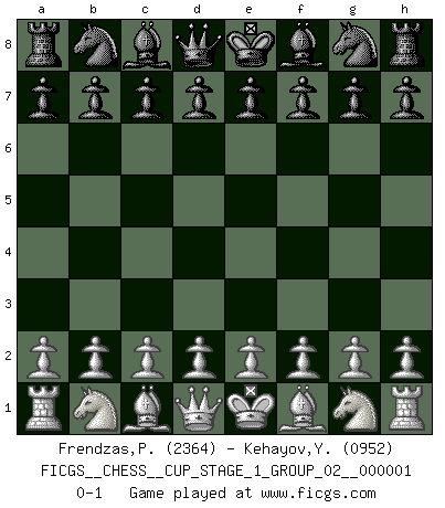 Last move : 0-1 2017 March 31 10:9:14 [Event "FICGS__CHESS__CUP_STAGE_1_GROUP_02__000001"] [Site "FICGS"] [Date "2017.03.01"] [Round "1"] [White "Frendzas,Panayotis"] [Black "Kehayov,Yulian"] [Result "0-1"] [WhiteElo "2364"] [BlackElo "0952"] 0-1 This chess game has been lost on time (started : 2017.03.01 0:58:30) Player Black won this chess game. Follow this game move after move (download)There is only one thing Fischer does in Chess without pleasure: to lose ! (Boris Spassky) Wenn Du nicht kämpfst, um anderen etwas zu beweisen, sondern nur für Dich selbst, dann bist du fast unbesiegbar. (Garry Kasparov) Ser exitoso en el Ajedrez te permite descubrir tu propia personalidad. Eso es lo que deseo para los niños de mi clase. (Saudin Robovic) Même un GMI sait rarement calculer sur plus de cinq coups une attaque à sacrifices. (Rudolf Spielmann) Beep ! (R2D2 in Star Wars ep.3)
