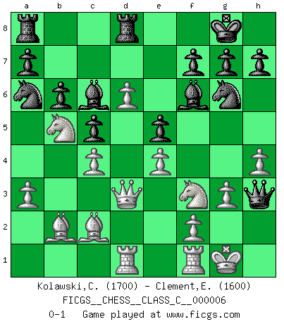Last move : 0-1 2006 October 22 19:24:36 [Event "FICGS__CHESS__CLASS_C__000006"] [Site "FICGS"] [Date "2006.05.31"] [Round "1"] [White "Kolawski,Christof"] [Black "Clement,Etienne"] [Result "0-1"] [WhiteElo "1700"] [BlackElo "1600"] 1.d4 Nf6 2.Nf3 b6 3.e3 e6 4.Bd3 Bb7 5.O-O Be7 6.c4 O-O 7.Nc3 d5 8.b3 dxc4 9.bxc4 c5 10.Bb2 Nc6 11.d5 Nb4 12.e4 Nh5 13.Bb1 Nf4 14.a3 Na6 15.g3 Ng6 16.Qd3 e5 17.Nb5 Bf6 18.d6 Qd7 19.h4 Qh3 20.Bc2 Bc6 21.Rad1 Rfd8 0-1 This chess game has been lost on time (started : 2006.05.31 8:2:36) Queen's Indian defense Kingside Castling by player White (move 5) Kingside Castling by player Black (move 6) Player Black won this chess game. Follow this game move after move (download)Chess is not like life... it has rules ! (Mark Pasternak) Ich habe die Schachforschung dermaßen betrieben, dass sie auf eine wissenschaftliche Basis gestellt wurde. (Mikhail Moiseyevich Botvinik) El Ajedrez no es una pizca de inferior al violín, y tenemos un gran número de violinistas profesionales. (Mikhail Botvinnik) Des idées, des idées, j'en ai cent, j'en ai mille. Des bonnes, des mauvaises, applicables, irréalisables... Il suffit de faire le tri ! (Roos) Life is pain my dear and anyone who says otherwise is selling something. (Princess Bride)