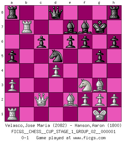 Last move : 0-1 2017 June 6 20:12:59 [Event "FICGS__CHESS__CUP_STAGE_1_GROUP_02__000001"] [Site "FICGS"] [Date "2017.03.01"] [Round "1"] [White "Velasco,Jose Maria"] [Black "Hanson,Aaron"] [Result "0-1"] [WhiteElo "2082"] [BlackElo "1800"] 1.d4 d5 2.c4 e6 3.Nc3 Nf6 4.Nf3 c6 5.Bg5 h6 6.Bh4 dxc4 7.e4 g5 8.Bg3 b5 9.Be2 b4 10.Na4 Nxe4 11.Be5 Nf6 12.Nc5 c3 13.bxc3 bxc3 14.Qb3 Nbd7 15.Nxd7 Bxd7 16.O-O Be7 17.Qxc3 Nd5 18.Qc2 f6 19.Bg3 Kf8 20.Rfb1 a5 21.a3 Kg7 22.Rb2 Be8 23.Rb7 Bf7 0-1 This chess game has been lost on time (started : 2017.03.01 0:58:30) QGD Semi-Slav Kingside Castling by player White (move 16) Player Black won this chess game. Follow this game move after move (download)The hallmark of the artist is simplicity. (Larry Evans) Mein erstes Ziel war nicht, die Partie zu gewinnen, sondern eine Figur zu opfern. -- der junge (Wilhelm Steinitz) El ganar no lo es todo... pero el perder es nada. (Mednis) On croit qu'il y a plus de mauvais joueurs que de bons joueurs, c'est faux : Il y a autant de joueurs qui gagnent que de joueurs qui perdent. (Philippe Geluck) Nothing is more important for teaching us to understand the concepts we have than constructing fictitious ones. (Ludwig Wittgenstein)