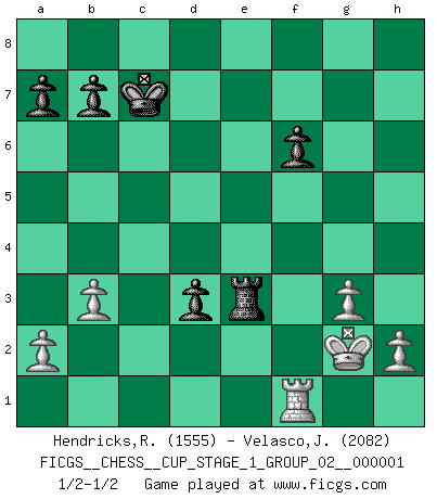 Last move : 1/2-1/2 2017 May 26 15:16:55 [Event "FICGS__CHESS__CUP_STAGE_1_GROUP_02__000001"] [Site "FICGS"] [Date "2017.03.01"] [Round "1"] [White "Hendricks,Richard"] [Black "Velasco,Jose Maria"] [Result "1/2-1/2"] [WhiteElo "1555"] [BlackElo "2082"] 1.d4 Nf6 2.Nf3 e6 3.Bg5 c5 4.e3 Qb6 5.Nbd2 d5 6.Bxf6 gxf6 7.c4 cxd4 8.exd4 Nc6 9.cxd5 exd5 10.Bd3 Nxd4 11.O-O Nc6 12.Nb3 Be6 13.Nfd4 Nxd4 14.Nxd4 O-O-O 15.Qc1+ Kb8 16.Qf4+ Bd6 17.Qxf6 h5 18.Nb5 Rhg8 19.Kh1 d4 20.b3 Bd5 21.f3 Bc7 22.Qf5 Be6 23.Qe4 h4 24.Nxc7 Qxc7 25.Rae1 h3 26.g3 Rge8 27.Qe5 Qxe5 28.Rxe5 f6 29.Re2 Bd5 30.Rxe8 Rxe8 31.Kg1 Re3 32.Bf5 Bxf3 33.Bxh3 Kc7 34.Bg2 Bxg2 35.Kxg2 d3 1/2-1/2 Queen's pawn : Torre attack Kingside Castling by player White (move 11) Queenside Castling by player Black (move 14) This chess game ended in a draw. Follow this game move after move (download)All my games are real. (Bobby Fischer) Ich war schon mal beim Dopingtest. Da musste ich Urin abgeben, während Dritte zusahen. (Elisabeth Pähtz) El Ajedrez detiene a su maestro dentro de sus propios vínculos, encadenando la mente y el cerebro, por lo que la libertad interior del mas fuerte debe sufrir. (Albert Einstein) La menace est plus forte que l'exécution. (Aaron Nimzovitch) The question of whether computers can think is just like question of whether submarines can swim. (Edsger W. Dijkstra)