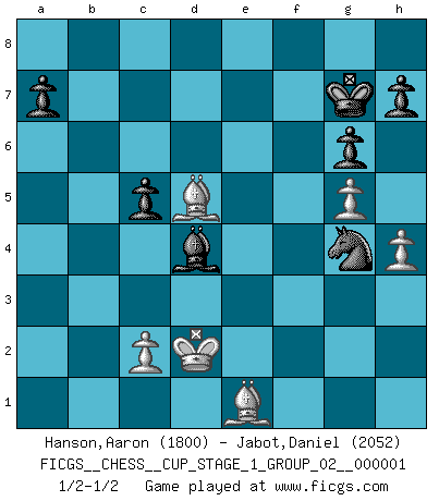 Last move : 1/2-1/2 2017 June 20 14:33:4 [Event "FICGS__CHESS__CUP_STAGE_1_GROUP_02__000001"] [Site "FICGS"] [Date "2017.03.01"] [Round "1"] [White "Hanson,Aaron"] [Black "Jabot,Daniel"] [Result "1/2-1/2"] [WhiteElo "1800"] [BlackElo "2052"] 1.f4 d5 2.Nf3 g6 3.d3 Bg7 4.g3 c6 5.Nc3 Nf6 6.e4 dxe4 7.dxe4 Qxd1+ 8.Kxd1 O-O 9.e5 Bg4 10.Be2 Ne8 11.Be3 f6 12.exf6 Nxf6 13.Re1 Nbd7 14.Kc1 Rae8 15.Bd4 Kh8 16.b4 Bxf3 17.Bxf3 e5 18.fxe5 Ng8 19.Be2 b6 20.Rb1 Re7 21.Kb2 c5 22.bxc5 bxc5 23.Be3 Rxe5 24.Bd2 Nb6 25.Kc1 Rfe8 26.a4 Nxa4 27.Rb7 Nxc3 28.Bxc3 R5e7 29.Rxe7 Rxe7 30.Ba5 Bd4 31.Bf3 Rxe1+ 32.Bxe1 Nf6 33.Kd2 Nd7 34.g4 Kg7 35.g5 Ne5 36.Bd5 Ng4 37.h4 1/2-1/2 Bird's Opening Kingside Castling by player Black (move 8) This chess game ended in a draw. Follow this game move after move (download)We like to think. (Gary Kasparov) Ich tröste mich mit dem Vergnügen, daß Schachfans, Zuschauer und Leser glücklich sind, wenn ein Großmeister etwas riskiert, statt nur Klötzchen zu schieben. (Mikhail Nekhemyevich Tal) El Ajedrez, como cualquier otra actividad creativa, puede existir solo a través de méritos combinados de aquellos que tienen talento creativo y de aquellos que tienen la habilidad de organizar un trabajo creativo. (Mikhail Botvinnik) Le plus grand jeu de l'esprit jamais inventé, plus vous l'apprenez, plus vous y prenez du plaisir. (Garry Kasparov) You can only get smarter by playing a smarter opponent. (Revolver, movie)