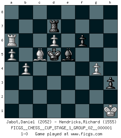 Last move : 1-0 2017 June 4 17:23:21 [Event "FICGS__CHESS__CUP_STAGE_1_GROUP_02__000001"] [Site "FICGS"] [Date "2017.03.01"] [Round "1"] [White "Jabot,Daniel"] [Black "Hendricks,Richard"] [Result "1-0"] [WhiteElo "2052"] [BlackElo "1555"] 1.e4 c5 2.Nf3 Nc6 3.d4 cxd4 4.Nxd4 g6 5.c4 Bg7 6.Be3 Nf6 7.Nc3 Ng4 8.Qxg4 Nxd4 9.Qd1 Ne6 10.Rc1 Qa5 11.Bd3 d6 12.O-O Bd7 13.f4 Nc5 14.Bb1 Na4 15.Nxa4 Bxa4 16.b3 Bc6 17.Qg4 b6 18.Rf2 Rd8 19.Qh4 h5 20.Re2 Bc3 21.Kh1 Bf6 22.Qf2 Rd7 23.h3 h4 24.Bd3 Qh5 25.Rf1 Qa5 26.Rc2 e6 27.Rd1 Rg8 28.Qf1 Kf8 29.Bd2 Qh5 30.Be2 Qh7 31.e5 Be7 32.Bb4 g5 33.f5 Qxf5 34.Qxf5 exf5 35.exd6 Bf6 36.c5 Be4 37.R2c1 bxc5 38.Rxc5 g4 39.Rc8+ Kg7 40.Rxg8+ Kxg8 41.hxg4 h3 42.Bf3 Bxf3 43.gxf3 fxg4 44.fxg4 Be5 45.Rd3 f6 46.Bc5 Kf8 47.b4 a6 48.Ra3 Kf7 49.Rxa6 Ke6 50.a4 Kd5 51.a5 1-0 Sicilian : Accelerated Fianchetto, Breyer variation Kingside Castling by player White (move 12) Player White won this chess game. Follow this game move after move (download)Openings teach you openings. Endgames teach you chess ! (Stephan Gerzadowicz) Ich hatte Zahnschmerzen im ersten Spiel. In der zweiten Partie tat mir der Kopf weh. In der dritten war es eine Rheuma-Attacke und während der vierten fühlte ich mich nicht gut. Und in der fünften? Nun, man muss doch nicht jedes Spiel gewinnen, oder? (Savielly Grigorievitsch Tartakower) El hombre es un frívolo, una creatura engañosa y como un jugador de Ajedrez, se preocupa mas por el proceso de obtener su meta que de la meta por sí misma. (Dostoyevsky) Les ravages du H expliquent la différence de niveau entre Tal et Thal [Abergel]. I'm extremely disappointed. I send you out for exciting, new designer drugs, you come back with tomato sauce. (Gregory House, House M.D.)