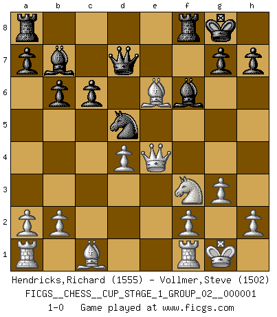 Last move : 1-0 2017 March 8 16:7:36 [Event "FICGS__CHESS__CUP_STAGE_1_GROUP_02__000001"] [Site "FICGS"] [Date "2017.03.01"] [Round "1"] [White "Hendricks,Richard"] [Black "Vollmer,Steve"] [Result "1-0"] [WhiteElo "1555"] [BlackElo "1502"] 1.d4 f5 2.g3 Nf6 3.Bg2 e6 4.c4 Be7 5.Nf3 O-O 6.O-O d5 7.Qc2 c6 8.Nbd2 Qe8 9.Ne5 b6 10.Ndf3 Bb7 11.cxd5 Nxd5 12.e4 fxe4 13.Qxe4 Bf6 14.Bh3 Nd7 15.Nxd7 Qxd7 16.Bxe6+ 1-0 Dutch defense Kingside Castling by player Black (move 5) Kingside Castling by player White (move 6) Player White won this chess game. Follow this game move after move (download)It is difficult to play against Einstein's theory --on his first loss to Fischer. (Mikhail Tal) Die FIDE ist dabei in die Hände der russischen Mafia zu fallen. (Larry Evans) Cuando no sepas que mover, espera por una idea que se le venga a la la cabeza de tu oponente. Tenlo por seguro de que esa idea estará incorrecta. (Siegbert Tarrasch) Les sacrifices démontrent seulement que quelqu'un a gaffé. (Savielly Tartacover) Man with more than one clock never knows what time it is. (Chinese thought)