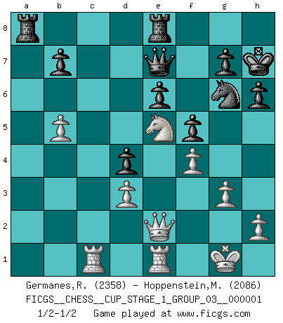 Last move : 1/2-1/2 2017 April 22 1:2:24 [Event "FICGS__CHESS__CUP_STAGE_1_GROUP_03__000001"] [Site "FICGS"] [Date "2017.03.01"] [Round "1"] [White "Germanes,Ramil"] [Black "Hoppenstein,Michael"] [Result "1/2-1/2"] [WhiteElo "2358"] [BlackElo "2086"] 1.Nf3 Nf6 2.g3 d5 3.Bg2 c5 4.O-O e6 5.c4 d4 6.e3 Nc6 7.exd4 cxd4 8.d3 Bd6 9.Bg5 h6 10.Bxf6 Qxf6 11.Nbd2 Qe7 12.Rc1 O-O 13.Re1 Rd8 14.Ne4 Bc7 15.c5 Bd7 16.a3 a5 17.b3 Rab8 18.Nfd2 Ne5 19.Qe2 Bc6 20.b4 axb4 21.axb4 Bd5 22.f4 Ng6 23.b5 Ra8 24.Qf1 f5 25.Nd6 Bxg2 26.Qxg2 Bxd6 27.cxd6 Rxd6 28.Nc4 R6d8 29.Qe2 Re8 30.Ne5 Kh7 1/2-1/2 Reti Opening Kingside Castling by player White (move 4) Kingside Castling by player Black (move 12) This chess game ended in a draw. Follow this game move after move (download)Later, I began to succeed in decisive games. Perhaps because I realized a very simple truth: not only was I worried, but also my opponent. (Mikhail Tal) Immer nach dem besten Zug zu suchen ist ziemlich unpraktisch. (Nigel Short) Buenas posiciones no logran ganar juegos, buenas movidas sí. (Gerald Abrahams) Même si l'adversaire joue le coup analysé précédemment, recommencez l'analyse en voyant la nouvelle position. Première règle de Blumenfeld We cannot be sure of having something to live for unless we are willing to die for it. (Ernesto Che Guevara)