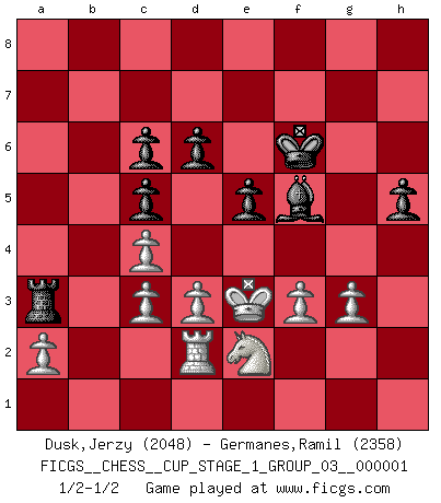 Last move : 1/2-1/2 2017 June 10 14:17:11 [Event "FICGS__CHESS__CUP_STAGE_1_GROUP_03__000001"] [Site "FICGS"] [Date "2017.03.01"] [Round "1"] [White "Dusk,Jerzy"] [Black "Germanes,Ramil"] [Result "1/2-1/2"] [WhiteElo "2048"] [BlackElo "2358"] 1.e4 c5 2.Nf3 Nc6 3.Bb5 g6 4.Bxc6 bxc6 5.O-O Bg7 6.Re1 Nh6 7.c3 O-O 8.h3 f5 9.e5 Nf7 10.d3 Ba6 11.c4 d6 12.e6 Ne5 13.Nxe5 Bxe5 14.Nd2 Bg7 15.Nf3 Bc8 16.Rb1 h6 17.Bd2 Rb8 18.Qa4 g5 19.Qxa7 Rb7 20.Qa3 Qe8 21.Bc3 Qg6 22.Re2 g4 23.Nh4 Qg5 24.g3 f4 25.Bxg7 Qxg7 26.Rbe1 gxh3 27.Kh2 Kh7 28.Qc3 Qxc3 29.bxc3 f3 30.Rd2 Rf6 31.Kxh3 Rxe6 32.Rxe6 Bxe6+ 33.Kh2 Ra7 34.Nxf3 Kg7 35.Ng1 Ra3 36.Ne2 Kf7 37.f3 h5 38.Kg1 Kf6 39.Kf2 Bf5 40.Ke3 e5 1/2-1/2 Sicilian : Nimzovich-Rossolimo attack (with ...g6, without ...d6) Kingside Castling by player White (move 5) Kingside Castling by player Black (move 7) This chess game ended in a draw. Follow this game move after move (download)No price is too great for the scalp of the enemy King. (Koblentz) Der Partner hat auch seine Existenzberechtigung. (Savielly Grigorievitsch Tartakower) Mi estilo es algo parecido entre un poco de Tal y Petrosian. (Reshevsky) Je menace de comprendre la position. (Anonyme) The good fighters of old first put themselves beyond the possibility of defeat, and then waited for an opportunity of defeating the enemy. (Sun Tzu)