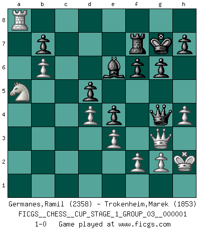 Last move : 1-0 2017 May 3 9:33:57 [Event "FICGS__CHESS__CUP_STAGE_1_GROUP_03__000001"] [Site "FICGS"] [Date "2017.03.01"] [Round "1"] [White "Germanes,Ramil"] [Black "Trokenheim,Marek"] [Result "1-0"] [WhiteElo "2358"] [BlackElo "1853"] 1.Nf3 Nf6 2.c4 g6 3.d4 Bg7 4.Nc3 d5 5.h4 c6 6.Bg5 Ne4 7.e3 O-O 8.Qb3 Na6 9.cxd5 Nxc3 10.bxc3 cxd5 11.Bd3 f6 12.Bf4 e5 13.Bg3 Re8 14.Bb5 Re6 15.a4 Nc7 16.O-O Rb6 17.c4 Nxb5 18.cxb5 e4 19.Nd2 Re6 20.Rfc1 Re7 21.a5 Bf8 22.b6 axb6 23.axb6 Rxa1 24.Rxa1 Kg7 25.Ra5 Be6 26.Ra7 Qe8 27.Bd6 Rf7 28.Bxf8+ Kxf8 29.Qb4+ Kg7 30.Nb3 Qb8 31.Qa5 Qe8 32.Ra8 Qc6 33.Qc5 Qd7 34.Na5 Qa4 35.Qd6 Qd1+ 36.Kh2 Qg4 37.Qg3 1-0 Reti Opening Kingside Castling by player Black (move 7) Kingside Castling by player White (move 16) Player White won this chess game. Follow this game move after move (download)All I want to do, ever, is just play Chess. (Bobby Fischer) Ein typischer, sehr verbreiteter Gedankenschädling ist der, daß der betreffende Amateur von der Annanhme ausgeht, daß jeder einzelne Zug etwas zu leisten habe. (Aaron Nimzowitsch) Cuando me preguntan: -¿Cual es el secreto que te hace hacer mejores movidas que tus oponentes?, Yo respondo: Me da gusto que me pregunten eso, porque, como veran, hay una simple razón. Yo pienso mis propias movidas y dejo a mi oponente que el piense las suyas. (Alexander Alekhine) Aucun coup ne doit être joué sans but. (Pedro Damiano) Humor is by far the most significant activity of the human brain. (Edward De Bono)