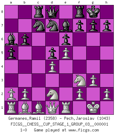 Last move : 1-0 2017 June 15 7:45:17 [Event "FICGS__CHESS__CUP_STAGE_1_GROUP_03__000001"] [Site "FICGS"] [Date "2017.03.01"] [Round "1"] [White "Germanes,Ramil"] [Black "Pech,Jaroslav"] [Result "1-0"] [WhiteElo "2358"] [BlackElo "1043"] 1.Nf3 Nf6 2.g3 d5 3.Bg2 e6 4.c4 Be7 5.O-O O-O 6.d4 Nbd7 7.Qc2 c6 8.Nbd2 b6 9.e4 Bb7 10.e5 Ne8 11.cxd5 cxd5 12.Re1 Rc8 13.Qa4 a6 14.Bf1 Nc7 15.Bd3 a5 16.Qd1 Ba6 17.Bb1 1-0 Reti Opening Kingside Castling by player White (move 5) Kingside Castling by player Black (move 5) Player White won this chess game. Follow this game move after move (download)The stomach is an essential part of the Chess master. (Bent Larsen) Eine Person mit durchschnittlichem IQ kann etwa eine ELO von 2000 erreichen. (Jonathan Levitt) En el Ajedrez, tal como es jugado por los Maestros, practicamente la suerte es eliminada. (Emanuel Lasker) Le plus grand jeu de l'esprit jamais inventé, plus vous l'apprenez, plus vous y prenez du plaisir. (Garry Kasparov) Games, world of games... There's always an opponent, and there's always a victim. (Revolver, movie)