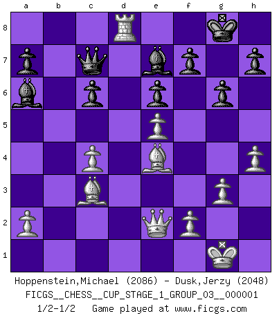 Last move : 1/2-1/2 2017 March 8 18:6:31 [Event "FICGS__CHESS__CUP_STAGE_1_GROUP_03__000001"] [Site "FICGS"] [Date "2017.03.01"] [Round "1"] [White "Hoppenstein,Michael"] [Black "Dusk,Jerzy"] [Result "1/2-1/2"] [WhiteElo "2086"] [BlackElo "2048"] 1.d4 Nf6 2.c4 e6 3.Nf3 b6 4.g3 Ba6 5.b3 Bb4+ 6.Bd2 Be7 7.Bg2 c6 8.Bc3 d5 9.Nbd2 Nbd7 10.e4 Nxe4 11.Nxe4 dxe4 12.Ne5 Nxe5 13.dxe5 O-O 14.Bxe4 b5 15.O-O bxc4 16.Qe2 Qc7 17.bxc4 Rfd8 18.Rfd1 g6 19.h4 Rxd1+ 20.Rxd1 Rd8 21.Rxd8+ 1/2-1/2 Queen's Indian : Nimzovich variation (exaggerated Fianchetto) Kingside Castling by player Black (move 13) Kingside Castling by player White (move 15) This chess game ended in a draw. Follow this game move after move (download)Robert Fischer is a law unto himself. (Larry Evans) Ein bischen Romantik kann weder im Schach noch in der Liebe schaden. Also versuche ich mich ab und zu daran zu erinnern. (Nigel Short) Botvinnik trataba de restarle el misterio al Ajedrez, siempre relacionandolo a situaciones de la vida ordinaria. El gustaba de llamar al Ajedrez un típico problema inexacto similar a aquellos de los cuales la gente siempre tiene que enfrentarse en la vida cotidiana. (Garry Kasparov) Nous vivons dans un monde échiquéen : chaque jour qui passe est un défi à relever. (Philosophe Sasha) Everybody lies. (Gregory House, House M.D.)