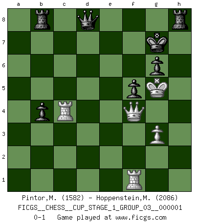 Last move : 0-1 2017 March 18 6:48:53 [Event "FICGS__CHESS__CUP_STAGE_1_GROUP_03__000001"] [Site "FICGS"] [Date "2017.03.01"] [Round "1"] [White "Pintor,Manuel"] [Black "Hoppenstein,Michael"] [Result "0-1"] [WhiteElo "1582"] [BlackElo "2086"] 1.e4 c5 2.Nc3 d6 3.g3 g6 4.Bg2 Bg7 5.d3 Nf6 6.f4 Nc6 7.Nf3 O-O 8.O-O Rb8 9.h3 b5 10.a3 a5 11.Ng5 b4 12.axb4 axb4 13.Ne2 Bb7 14.c3 c4 15.d4 h6 16.e5 dxe5 17.fxe5 hxg5 18.exf6 exf6 19.d5 Ne5 20.h4 Nd3 21.hxg5 fxg5 22.Nd4 Bxd5 23.Bxd5 Qxd5 24.Qf3 Bxd4+ 25.cxd4 Qxd4+ 26.Kh2 Nxc1 27.Raxc1 Qxb2+ 28.Kh3 Kg7 29.Rxc4 Rh8+ 30.Kg4 f5+ 31.Kxg5 Qd2+ 32.Qf4 Qd8+ 0-1 Sicilian : Closed Kingside Castling by player Black (move 7) Kingside Castling by player White (move 8) Player Black won this chess game. Follow this game move after move (download)Human affairs are like a Chess game: only those who do not take it seriously can be called good players. (Hung Tzu Ch'eng) Es hat in meinem Leben Zeiten gegeben, in denen das Schachspiel, wenn nicht zum Lebenszweck, so doch zu einem regelrechten Lebensersatz geworden ist. Man fühlt sich in solchen Zeiten nicht so, als besäße man eine göttliche Gabe, sondern eher so, als sei man von ihr besessen. (Garry Kasparov) El tablero es el mundo, las piezas es el fenomeno del universo, las reglas del juego son lo que llamamos leyes de la naturaleza y el jugador del lado opuesto, se encuentra oculto a nuestra vista. (Thomas Huxley) Dieu déplace le joueur, et celui-ci la pièce. Quel Dieu derrière Dieu commence donc la trame ? Arturo Perez-Reverte (prix de littérature policière 1993). The intuitive mind is a sacred gift; the rational mind is a faithful servant. We have created a society that honors the servant but has forgotten the gift. (Albert Einstein)