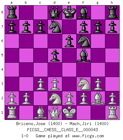 Last move : 1-0 2007 May 23 22:45:27 [Event "FICGS__CHESS__CLASS_E__000043"] [Site "FICGS"] [Date "2007.04.04"] [Round "1"] [White "Briceno,Jose"] [Black "Mach,Jiri"] [Result "1-0"] [WhiteElo "1400"] [BlackElo "1400"] 1.Nf3 Nf6 2.g3 d5 3.Bg2 Bf5 4.d3 e6 5.c3 Nbd7 6.Nbd2 1-0 This chess game has been lost on time (started : 2007.04.04 9:31:25) Reti Opening Player White won this chess game. Follow this game move after move (download)When you play Bobby, it is not a question if you win or lose. It is a question if you survive. (Boris Spassky) Man wirke der falschen Auffassung entgegen, als ob jeder Zug Unmittelbares zu leisten habe; auch Werte- und Ruhezüge haben ihre Existenzberechtigung. (Aaron Nimzowitsch) El Ajedrez es sobre todo, ¡una pelea!. (Emanuel Lasker) Psychologiquement, tu dois avoir confiance en toi même, mais cette confiance doit être basée sur des faits. (Robert Fischer) In every real man a child is hidden that wants to play. (Friedrich Nietzsche)