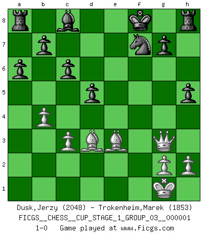 Last move : 1-0 2017 March 9 7:4:42 [Event "FICGS__CHESS__CUP_STAGE_1_GROUP_03__000001"] [Site "FICGS"] [Date "2017.03.01"] [Round "1"] [White "Dusk,Jerzy"] [Black "Trokenheim,Marek"] [Result "1-0"] [WhiteElo "2048"] [BlackElo "1853"] 1.e4 e5 2.Nf3 Nc6 3.Bb5 Bc5 4.O-O Nf6 5.Nxe5 Nxe5 6.d4 a6 7.Be2 Nxe4 8.dxc5 Nxc5 9.b4 Ne6 10.f4 Nc6 11.f5 Qf6 12.fxe6 Qxa1 13.exf7+ Kf8 14.c3 Qxb1 15.Bd3 Qxa2 16.Re1 Qxf7 17.Rf1 Ne5 18.Rxf7+ Nxf7 19.Qf3 c6 20.Be3 d6 21.Bc4 d5 22.Bd3 h5 23.Qg3 1-0 Ruy Lopez : Classical (Cordel) defense Kingside Castling by player White (move 4) Player White won this chess game. Follow this game move after move (download)I play correspondence chess because it is both art and science while chess is art only. (A player at FICGS) Die Jungen erwarten, dass Opa einfach umfällt. Dann aber kann Opa fünf Stunden lang Schach spielen und die jungen Gegner an die Wand drücken. (Viktor Kortschnoi) Los libros de Ajedrez deben de usarse igual como usamos los anteojos: para mejorar la vista, aunque algunos jugadores los quieren usar como si ellos les otorgaran la vision. (José Raúl Capablanca) Ce qui est bien, c'est d'avoir tout un tas de pièces en prise : l'adversaire ne peut en prendre qu'une à la fois. Cité par Thierry Audin. I have opinions of my own - strong opinions - but I don't always agree with them. (George Bush)
