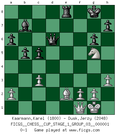 Last move : 0-1 2017 May 12 3:35:38 [Event "FICGS__CHESS__CUP_STAGE_1_GROUP_03__000001"] [Site "FICGS"] [Date "2017.03.01"] [Round "1"] [White "Kaarmann,Karel"] [Black "Dusk,Jerzy"] [Result "0-1"] [WhiteElo "1800"] [BlackElo "2048"] 1.d4 Nf6 2.Bf4 g6 3.Nf3 Bg7 4.Nbd2 O-O 5.e3 d6 6.Bd3 Nbd7 7.O-O Qe8 8.Bg5 e5 9.dxe5 Nxe5 10.Nxe5 Qxe5 11.Bxf6 Qxf6 12.c3 d5 13.Nf3 Rd8 14.Qe2 c5 15.Rad1 a6 16.h3 b5 17.Bc2 Bb7 18.Rd2 Qb6 19.Rfd1 Rd6 20.e4 Bh6 21.e5 Rd7 22.e6 Re7 23.exf7+ Kxf7 24.Qf1 Bxd2 25.Rxd2 Rae8 26.Bd1 d4 27.Re2 Rxe2 28.Bxe2 dxc3 29.bxc3 Qd6 30.Ng5+ Kg8 0-1 This chess game has been lost on time (started : 2017.03.01 0:58:33) Queen's pawn game Kingside Castling by player Black (move 4) Kingside Castling by player White (move 7) Player Black won this chess game. Follow this game move after move (download)Fischer is the strongest player in the world. In fact, the strongest player who ever lived. (Larry Evans) Schach ist wie eine schöne Frau, zu der wir ständig zurückkehren, gleichviel, wie oft sie uns zurückweist. (Anonymous) Es muy difícil jugar en contra de la teoría de Einstein. - en su primera derrota en contra de Fischer (Mikhail Tal) C'est la seule position que je connaisse où les deux camps sont mals. Propos prêtés à V. Anand. To steal ideas from one person is plagiarism. To steal from many is research. (Unknown)