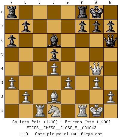 Last move : 1-0 2007 June 10 1:24:35 [Event "FICGS__CHESS__CLASS_E__000043"] [Site "FICGS"] [Date "2007.04.04"] [Round "1"] [White "Galicza,Pali"] [Black "Briceno,Jose"] [Result "1-0"] [WhiteElo "1400"] [BlackElo "1400"] 1.f4 d5 2.d3 Nc6 3.Nf3 Nf6 4.e3 Bg4 5.Be2 Bxf3 6.Bxf3 e5 7.O-O Bc5 8.fxe5 Nxe5 9.d4 Nxf3+ 10.Qxf3 Bd6 11.c4 c6 12.cxd5 cxd5 13.Nc3 a6 14.Bd2 Qd7 15.Rac1 O-O 16.Nd1 Ng4 17.g3 Qe6 18.a3 Qh6 19.Qxg4 1-0 Bird's Opening Kingside Castling by player White (move 7) Kingside Castling by player Black (move 15) Player White won this chess game. Follow this game move after move (download)You have to have the fighting spirit. You have to force moves and take chances. (Bobby Fischer) Intelligenz läßt sich nicht am Weg, sondern nur am Ergebnis feststellen. (Garry Kasparov) Una clavada es mas poderosa que una espada. (Fred Reinfeld) Dans le domaine de la peinture, de la gravure et de la sculpture, dès la première décennie de notre siècle, les artistes abandonnent la représentation de la partie d'échecs pour se concentrer sur les pièces, sur les échiquiers et sur toutes les variations auxquelles les unes et les autres peuvent donner lieu. On passe en quelque sorte d'un thème social à un thème musical (au sens de la musica médiévale, c'est-à-dire d'une notion qui inclue le rythme, l'harmonie, la construction et la déconstruction, etc.). Graphiquement et picturalement, l'échiquier apparaît comme une structure ouverte, dynamique, d'une richesse infinie, autorisant toutes les combinatoires et débouchant sur des mouvements et des rythmes de nature exponentielle. (Michel Pastoureau) Experience is the name we all give to our mistakes. (Oscar Wilde)