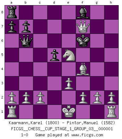Last move : 1-0 2017 April 7 12:31:1 [Event "FICGS__CHESS__CUP_STAGE_1_GROUP_03__000001"] [Site "FICGS"] [Date "2017.03.01"] [Round "1"] [White "Kaarmann,Karel"] [Black "Pintor,Manuel"] [Result "1-0"] [WhiteElo "1800"] [BlackElo "1582"] 1.d4 d5 2.Bf4 Nc6 3.Nf3 Bf5 4.e3 Nf6 5.Bd3 Ne4 6.Nbd2 f6 7.Nh4 Bd7 8.Qh5+ g6 9.Nxg6 Be6 10.Nxh8 Kd7 11.Qxh7 Bf5 12.Qxf5+ e6 13.Qh7+ Ne7 14.Nxe4 dxe4 15.Qxe4 c6 16.Bc4 e5 17.dxe5 Nd5 18.Bxd5 cxd5 19.Qa4+ Ke6 20.Ng6 fxe5 21.Nxe5 Qb6 22.Qd7+ Kf6 23.Qf7+ 1-0 Queen's pawn, Mason variation Player White won this chess game. Follow this game move after move (download)A passed Pawn increases in strength as the number of pieces on the board diminishes. (Capablanca) Ich bin stolz ein Bulgare zu sein. (Veselin Topalov) Un buen jugador siempre tiene buena suerte. (José Raúl Capablanca) Aucun coup ne doit être joué sans but. (Pedro Damiano) Imagination is more important than knowledge. Knowledge is limited. Imagination encircles the world. (Albert Einstein)