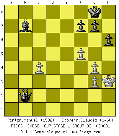 Last move : 0-1 2017 March 15 13:15:4 [Event "FICGS__CHESS__CUP_STAGE_1_GROUP_03__000001"] [Site "FICGS"] [Date "2017.03.01"] [Round "1"] [White "Pintor,Manuel"] [Black "Cabrera,Claudio"] [Result "0-1"] [WhiteElo "1582"] [BlackElo "1460"] 1.e4 e5 2.f4 d5 3.exd5 e4 4.Bc4 Nf6 5.Nc3 Bc5 6.Nge2 O-O 7.h3 Re8 8.d4 exd3 9.Qxd3 a6 10.Bd2 b5 11.Bb3 b4 12.Na4 Ne4 13.Nxc5 Nxc5 14.Qc4 Nxb3 15.axb3 a5 16.O-O Ba6 17.Qc5 Rxe2 18.Rf2 Rxf2 19.Qxf2 Qxd5 20.Re1 Nc6 21.Rd1 Rd8 22.c4 Qd3 23.Kh2 Nd4 24.Qe1 Bb7 25.Qe7 Nf5 26.Qg5 h6 27.Qg4 Ne3 28.Bxe3 Qxd1 29.f5 Qxg4 30.hxg4 Rd3 31.Bf4 Rxb3 32.Be5 a4 33.g3 a3 34.bxa3 bxa3 35.Bxc7 Rb2+ 36.Kh3 a2 37.Be5 a1Q 38.Bxb2 Qxb2 0-1 KGD : Falkbeer, 3...e4 Kingside Castling by player Black (move 6) Kingside Castling by player White (move 16) Promotion Queen by player Black (move 37) Player Black won this chess game. Follow this game move after move (download)In Chess, as it is played by masters, chance is practically eliminated. (Emanuel Lasker) Karpov ist ein Museumsstück. (Garry Kasparov) El Ajedrez te enseña a controlarl la excitación inicial que sientes cuando vez algo que parece bueno y te enseña a pensar objetivamente cuando te encuentras en problemas. (Stanley Kubrick) Echiquier : carré parfait, comme la Jérusalem nouvelle décrite par l'auteur de l'Apocalypse, huit cases sur huit, exaltation du chiffre 4, symbole du cosmos aux quatre horizons... où le noir et le blanc, l'ombre et la lumière, le mal et le bien s'entremêlent et se conjuguent. (Robert Couffignal, Le Gambit du poète) All the biggest technological inventions created by man - the airplane, the automobile, the computer - says little about his intelligence, but speaks volumes about his laziness. (Mark Kennedy)