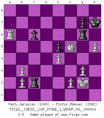 Last move : 1-0 2017 May 25 17:40:50 [Event "FICGS__CHESS__CUP_STAGE_1_GROUP_03__000001"] [Site "FICGS"] [Date "2017.03.01"] [Round "1"] [White "Pech,Jaroslav"] [Black "Pintor,Manuel"] [Result "1-0"] [WhiteElo "1043"] [BlackElo "1582"] 1.e4 e5 2.Nf3 Nc6 3.Bb5 a6 4.Ba4 Nf6 5.O-O b5 6.Bb3 d6 7.Re1 Na5 8.d4 Nxb3 9.axb3 Bg4 10.dxe5 Bxf3 11.Qxf3 dxe5 12.Nc3 Bb4 13.Bg5 O-O 14.Red1 Bd6 15.Nd5 Be7 16.Nxf6+ Bxf6 17.Rxd8 Bxd8 18.Bxd8 Rfxd8 19.Qc3 Rd7 20.g3 h6 21.Qc6 Rad8 22.Rxa6 Rd1+ 23.Kg2 R8d6 24.Qxb5 R6d2 25.Qe8+ Kh7 26.Ra8 Rxc2 27.Qxf7 Rd6 28.Qf5+ Rg6 29.h4 h5 30.Ra6 c6 31.Qxh5+ Rh6 32.Qf5+ Rg6 33.h5 1-0 Ruy Lopez : ...b5 & ...d6 Kingside Castling by player White (move 5) Kingside Castling by player Black (move 13) Player White won this chess game. Follow this game move after move (download)The isolated Pawn casts gloom over the entire chessboard. (Aaron Nimzovich) Spielt Blackmar-Diemer-Gambit, und das Matt kommt von selbst! (Emil Joseph Diemer) Evita las multitudes. Haz independientemente tu propio razonamiento. Trata de ser el jugador de Ajedrez, no la pieza de Ajedrez. (Ralph Charell) Il n'y a pas eu de défaite parce que je ne crois pas que cet ordinateur ait jamais existé. IBM a triché en refusant d'imprimer les modes de recherche de la machine. C'est évident, pendant le match, des coups décisifs ont été joués par des êtres humains. Aujourd'hui, les meilleurs spécialistes en informatique ne peuvent toujours pas expliquer comment Deep-Blue a pu jouer contre la logique des ordinateurs. IBM a gagné une guerre de communication, mais ils sont incapables de prouver que l'ordinateur a gagné tout seul. (Garry Kasparov) Thibault, I ask for draw. Game 13876. - Sorry Ilmars, you won. (FICGS chat)