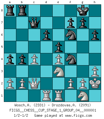 Last move : 1/2-1/2 2017 April 23 15:3:56 [Event "FICGS__CHESS__CUP_STAGE_1_GROUP_04__000001"] [Site "FICGS"] [Date "2017.03.01"] [Round "1"] [White "Wosch,Arkadiusz"] [Black "Drozdovas,Arturas"] [Result "1/2-1/2"] [WhiteElo "2331"] [BlackElo "2091"] 1.e4 e5 2.Nf3 Nc6 3.Bc4 Nf6 4.d3 Bc5 5.c3 d6 6.O-O O-O 7.Bb3 h6 8.Re1 a5 9.d4 Ba7 10.h3 Re8 11.d5 Ne7 12.Bc2 c6 13.c4 b5 14.dxc6 b4 15.Ba4 Qc7 16.Nbd2 Nxc6 17.Nf1 Rd8 18.Be3 Ne7 19.Bxa7 Rxa7 20.Qc2 Bd7 21.Rad1 Bxa4 22.Qxa4 Ng6 23.Qc2 R7a8 24.Ne3 Nf4 25.Kh2 a4 26.Ng1 Rdb8 1/2-1/2 Two knights defense (Modern Bishop's Opening) Kingside Castling by player White (move 6) Kingside Castling by player Black (move 6) This chess game ended in a draw. Follow this game move after move (download)My opponents make good moves too. Sometimes I don't take these things into consideration. (Bobby Fischer) Mit Schach schule ich mein Gefühl für Geometrie, was für Tennis und Schach gleichermaßen wichtig ist. (Boris Becker) Los libros de Ajedrez deben de usarse igual como usamos los anteojos: para mejorar la vista, aunque algunos jugadores los quieren usar como si ellos les otorgaran la vision. (José Raúl Capablanca) La guerre est enfant de la passion, la passion est enfant du narcissisme et le narcissisme est l'enfant. (...) Une autre partie ? (Thibault de Vassal) The project of the man are lower than those of the sky. (Chinese proverb)