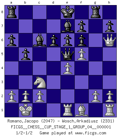 Last move : 1/2-1/2 2017 April 17 0:30:57 [Event "FICGS__CHESS__CUP_STAGE_1_GROUP_04__000001"] [Site "FICGS"] [Date "2017.03.01"] [Round "1"] [White "Romano,Jacopo"] [Black "Wosch,Arkadiusz"] [Result "1/2-1/2"] [WhiteElo "2047"] [BlackElo "2331"] 1.e4 c5 2.Nf3 Nc6 3.d4 cxd4 4.Nxd4 Nf6 5.Nc3 d6 6.Bg5 e6 7.Qd2 a6 8.O-O-O Bd7 9.f4 b5 10.Bxf6 gxf6 11.Kb1 Qb6 12.Nxc6 Bxc6 13.f5 Rg8 14.Qd3 Qc5 15.Re1 Qe5 16.Qd2 Be7 17.Qh6 1/2-1/2 Sicilian defense Queenside Castling by player White (move 8) This chess game ended in a draw. Follow this game move after move (download)Good offense and good defense both begin with good development. (Bruce A. Moon) Besser ein falscher Plan, logisch durchgeführt, als gar kein Plan. (Viktor Kortschnoi) Es muy difícil jugar en contra de la teoría de Einstein. - en su primera derrota en contra de Fischer (Mikhail Tal) Les réformistes prétendent que les progrès de la théorie conduiront à la disparition des échecs, et qu'il faut, pour leur rendre vie, en remanier les règles. En réalité, qu'exprime cette affirmation? Le mépris de l'intuition, de l'imagination et de tous les autres éléments qui font des échecs un art. (Alexander Alekhine) No, no, you're not thinking; you're just being logical. (Niels Bohr)