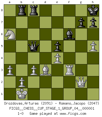 Last move : 1-0 2017 March 30 17:10:42 [Event "FICGS__CHESS__CUP_STAGE_1_GROUP_04__000001"] [Site "FICGS"] [Date "2017.03.01"] [Round "1"] [White "Drozdovas,Arturas"] [Black "Romano,Jacopo"] [Result "1-0"] [WhiteElo "2091"] [BlackElo "2047"] 1.e4 c5 2.Nf3 d6 3.d4 cxd4 4.Nxd4 Nf6 5.Nc3 a6 6.Be3 e5 7.Nb3 Be6 8.Be2 Nbd7 9.f4 exf4 10.Bxf4 Ne5 11.Qd4 Qb8 12.Rg1 Be7 13.g4 b5 14.O-O-O O-O 15.g5 Nfd7 16.h4 a5 17.Bxb5 Nf3 18.Qe3 Nxg1 19.Qxg1 Ne5 20.Nd4 a4 21.a3 Rc8 22.Qg3 Kh8 23.Nxa4 Bg4 24.Rf1 f6 25.Nc3 Qb6 26.Bxe5 dxe5 27.gxf6 Bxf6 28.Nd5 Qxd4 29.Qxg4 Qc5 30.Bd3 Qd4 31.Rf3 Rab8 32.c3 Rc6 33.Nb4 Rc7 34.h5 Qb6 35.Kb1 Qc5 36.Qg2 R7c8 37.Na6 1-0 Sicilian : Najdorf, Byrne (English) attack Queenside Castling by player White (move 14) Kingside Castling by player Black (move 14) Player White won this chess game. Follow this game move after move (download)With or without the title, Bobby Fischer was unquestionably the greatest player of his time. (Burt Hochberg) Computer sind die einzigen Gegner, die nicht immer eine Ausrede auf Lager haben, wenn sie gegen mich verlieren. (Robert James Fischer) La última cosa en que Fischer estaba interesado era en tonterías, siempre y cuando el Ajedrez estuviera involucrado. (Elie Agur) J'ai toujours senti une vague pitié pour l'homme qui ne connaît rien aux échecs, tout comme j'en aurais pour un homme ignorant de l'amour. Les Echecs, comme la musique ou comme l'amour, ont le pouvoir de rendre heureux. (Siegbert Tarrasch) Every man's memory is his private literature. (Aldous Huxley)