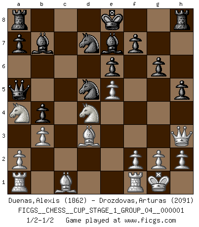 Last move : 1/2-1/2 2017 March 4 15:56:16 [Event "FICGS__CHESS__CUP_STAGE_1_GROUP_04__000001"] [Site "FICGS"] [Date "2017.03.01"] [Round "1"] [White "Duenas,Alexis"] [Black "Drozdovas,Arturas"] [Result "1/2-1/2"] [WhiteElo "1862"] [BlackElo "2091"] 1.d4 d5 2.c4 e6 3.Nc3 c6 4.e3 Nf6 5.Nf3 Nbd7 6.Bd3 dxc4 7.Bxc4 b5 8.Bd3 Bb7 9.e4 b4 10.Na4 c5 11.e5 Nd5 12.O-O cxd4 13.Nxd4 g6 14.Qg4 h5 15.Qh3 Qa5 16.b3 Be7 1/2-1/2 QGD : Semi-Slav Kingside Castling by player White (move 12) This chess game ended in a draw. Follow this game move after move (download)If I win a tournament, I win it by myself. I do the playing. Nobody helps me. (Bobby Fischer) Eine Person mit durchschnittlichem IQ kann etwa eine ELO von 2000 erreichen. (Jonathan Levitt) En el Ajedrez, tal como es jugado por los Maestros, practicamente la suerte es eliminada. (Emanuel Lasker) À la honte des hommes, on sait que les lois du jeu sont les seules qui soient partout justes, claires, inviolables et exécutées. Pourquoi l'Indien qui a donné les règles du jeu d'échecs est-il obéi de bon gré dans toute la terre, et que les décrétales des papes, par exemple, sont aujourd'hui un objet d'horreur et de mépris ? C'est que l'inventeur des échecs combina tout avec justesse pour la satisfaction des joueurs, et que les papes, dans leurs décrétales, n'eurent en vue que leur seul avantage. L'Indien voulut exercer également l'esprit des hommes et leur donner du plaisir; les papes ont voulu abrutir l'esprit des hommes. Voltaire (Dictionnaire philosophique / Garnier 1967) Without enthusiasm, virtue functions not at all, and vice only poorly. (Mignon McLaughlin, The Neurotic's Notebook, 1960)