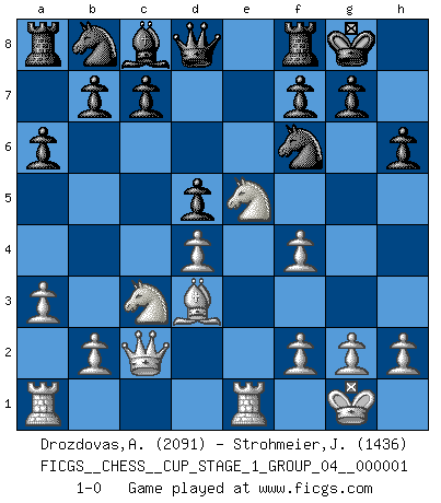 Last move : 1-0 2017 April 5 9:4:39 [Event "FICGS__CHESS__CUP_STAGE_1_GROUP_04__000001"] [Site "FICGS"] [Date "2017.03.01"] [Round "1"] [White "Drozdovas,Arturas"] [Black "Strohmeier,Josef"] [Result "1-0"] [WhiteElo "2091"] [BlackElo "1436"] 1.d4 d5 2.c4 e6 3.Nf3 Nf6 4.Nc3 Be7 5.Bf4 a6 6.cxd5 exd5 7.e3 O-O 8.Qc2 Bb4 9.Bd3 h6 10.a3 Bd6 11.O-O Bxf4 12.exf4 Bg4 13.Ne5 Bc8 14.Rfe1 1-0 Queen's gambit declined Kingside Castling by player Black (move 7) Kingside Castling by player White (move 11) Player White won this chess game. Follow this game move after move (download)When you play Bobby, it is not a question if you win or lose. It is a question if you survive. (Boris Spassky) Versuche, dich von der Sklaverei der Eröffnungsvarianten zu befreien. Stattdessen soll man gewisse Typenpositionen erlernen, die man eingehend analysiert. (Aaron Nimzowitsch) El jugador táctico sabe que hacer cuando hay algo que hacer; mientras que el estratega sabe que hacer cuando no hay nada que hacer. (Gerald Abrahams) Il n'y a plus de joueurs du niveau de Jacob Murray dont la seule quête est le beau jeu, le plaisir de voir les pièces construire quelque chose. Sur 10 idées à la minute, 9 seront sans intérêt, la dernière s'avèrera géniale. (Christian Bauer) A specialist learns more and more about less and less until he knows everything about nothing. (Nicholas Murray Butler)