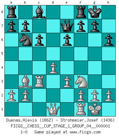 Last move : 1-0 2017 April 5 9:7:1 [Event "FICGS__CHESS__CUP_STAGE_1_GROUP_04__000001"] [Site "FICGS"] [Date "2017.03.01"] [Round "1"] [White "Duenas,Alexis"] [Black "Strohmeier,Josef"] [Result "1-0"] [WhiteElo "1862"] [BlackElo "1436"] 1.d4 d5 2.c4 e6 3.Nc3 Nf6 4.Bg5 Be7 5.e3 O-O 6.Nf3 h6 7.Bh4 c6 8.Bd3 dxc4 9.Bxc4 Nbd7 10.Rc1 Nd5 11.Bxe7 Qxe7 12.O-O N7b6 13.Bb3 Nxc3 14.Rxc3 1-0 QGD : Neo-Orthodox variation, 7.Bh4 Kingside Castling by player Black (move 5) Kingside Castling by player White (move 12) Player White won this chess game. Follow this game move after move (download)War is the child of passion, passion is the child of narcissism and narcissism is the child. (...) Another game ? (Thibault de Vassal) Die Elozahlen sind sehr schlecht für das Schach. Jetzt ist Schach eine Sportindustrie, die darauf zielt Elopunkte zu machen. (Miguel Najdorf) No hay un Gran Maestro de Ajedrez que sea normal; solo se diferencían ellos por la magnitud de su locura. (Viktor Korchnoi) La guerre est enfant de la passion, la passion est enfant du narcissisme et le narcissisme est l'enfant. (...) Une autre partie ? (Thibault de Vassal) True nature is revealed in times of difficulty. (Chinese proverb)