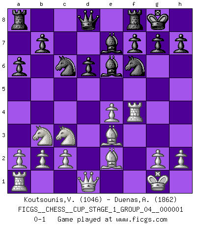 Last move : 0-1 2017 April 11 23:29:4 [Event "FICGS__CHESS__CUP_STAGE_1_GROUP_04__000001"] [Site "FICGS"] [Date "2017.03.01"] [Round "1"] [White "Koutsounis,Vassilios"] [Black "Duenas,Alexis"] [Result "0-1"] [WhiteElo "1046"] [BlackElo "1862"] 1.e4 c5 2.Nf3 d6 3.d4 cxd4 4.Nxd4 Nf6 5.Nc3 a6 6.Be2 e5 7.Nb3 Be7 8.O-O O-O 9.Be3 Be6 10.f4 exf4 11.Rxf4 Nc6 0-1 This chess game has been lost on time (started : 2017.03.01 0:58:37) Sicilian : Najdorf, Opovcensky variation Kingside Castling by player White (move 8) Kingside Castling by player Black (move 8) Player Black won this chess game. Follow this game move after move (download)If cunning alone were needed to excel, women would be the best Chess players. (Albin) Zeige mir drei Eröffnungsvarianten und ich beweise dir, dass zwei davon inkorrekt sind. (Emanuel Lasker) Debió haber existido una vez en que los hombres eran semidióses, de otra manera no hubiesen podido inventar el Ajedrez. (Gustav Schenk) La vie et les Echecs sont tous les deux une lutte constante. (Lasker) Knowledge rests not upon truth alone, but upon error also. (Carl G. Jung)